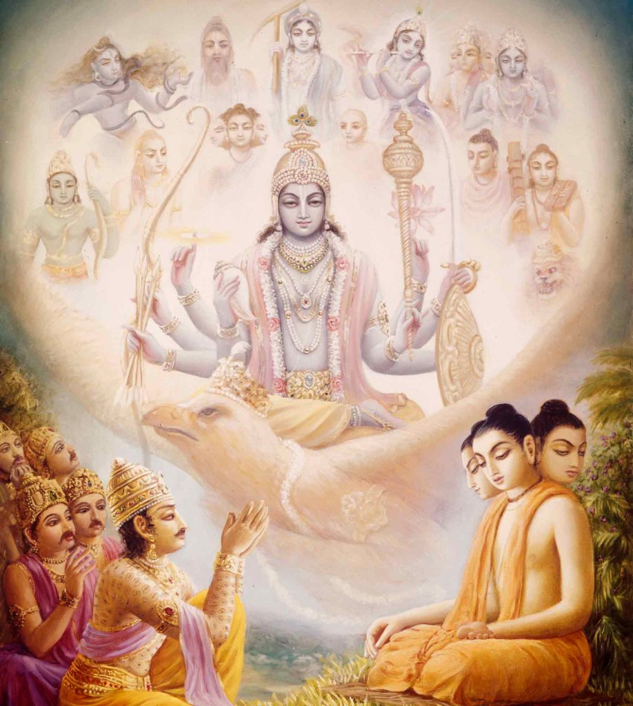 “ನಮ್ಮನ್ನು ಶತ್ರುಗಳಿಂದ ರಕ್ಷಿಸಲು ಆ ಭಗವಂತನು ತನ್ನ ಯೋಗಮಾಯೆಯಿಂದ ದೇವತೆಗಳ ಮಧ್ಯೆ ವಾಮನನಂಥ ರೂಪಗಳನ್ನೂ ಋಷಿಗಳ ಮಧ್ಯೆ ನರನಾರಾಯಣ, ಪರಶುರಾಮರೇ ಮೊದಲಾದ ರೂಪಗಳನ್ನೂ, ಪ್ರಾಣಿಗಳ ನಡುವೆ ಮತ್ಸ್ಯ, ಕೂರ್ಮಾದಿ ರೂಪಗಳನ್ನೂ, ಮನುಷ್ಯರ ನಡುವೆ ರಾಮ, ಕೃಷ್ಣಾದಿ ರೂಪಗಳನ್ನೂ ಸ್ವೀಕರಿಸುತ್ತಾನೆ. ಯುಗಯುಗದಲ್ಲೂ ಇಂಥ ದಿವ್ಯ ಅವತಾರಗಳನ್ನೆತ್ತಿ ನಮ್ಮನ್ನು ಕಾಪಾಡುವ ಆ ಸರ್ವ ದೇವೋತ್ತಮ ಪುರುಷನು ಈ ಇಡೀ ವಿಶ್ವಕ್ಕೆ ಕಾರಣವಾದ ಮೂಲಪುರುಷ ಮತ್ತು ಅವನ ಪ್ರಕೃತಿಯೆಂಬ ಸ್ತ್ರೀಶಕ್ತಿಯ ರೂಪಗಳಲ್ಲಿದ್ದಾನೆ; ಈ ವಿಶ್ವಕ್ಕಿಂತ ಬೇರೆಯಾಗಿದ್ದೂ ಈ ವಿಶ್ವರೂಪವಾಗಿಯೂ ಇದ್ದಾನೆ. ಸಕಲ ಜೀವಿಗಳ ಅಂತರಾತ್ಮನೂ ಸರ್ವರಿಗೂ ಶರಣ್ಯನೂ ಆದ ಅವನಲ್ಲೇ ಶರಣಾಗುತ್ತೇವೆ. ಅವನೇ ತನ್ನ ಭಕ್ತರಾದ ನಮ್ಮನ್ನು ರಕ್ಷಿಸಿ ನಮಗೆ ಮಂಗಳವನ್ನುಂಟುಮಾಡಲಿ.”