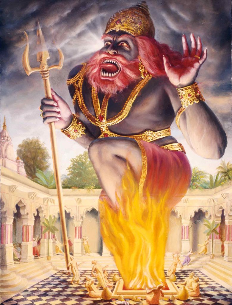 ಅವನು ಹೀಗೆ ಮಂತ್ರೋಚ್ಚಾರಣೆ ಮಾಡಲು ಅಗ್ನಿಕುಂಡದಿಂದ ಅತ್ಯಂತ ಘೋರರೂಪಿಯಾದ ಒಬ್ಬ ರಾಕ್ಷಸನು ಆವಿರ್ಭವಿಸಿದನು. ಯುಗಾಂತದಲ್ಲಿ ಸಕಲ ಲೋಕಗಳನ್ನೂ ನಾಶಮಾಡಹೊರಟಿರುವ ಹಂತಕನಂತೆ ಅವನು ಬಹಳ ಭಯಂಕರವಾಗಿ ಕಾಣುತ್ತಿದ್ದನು.