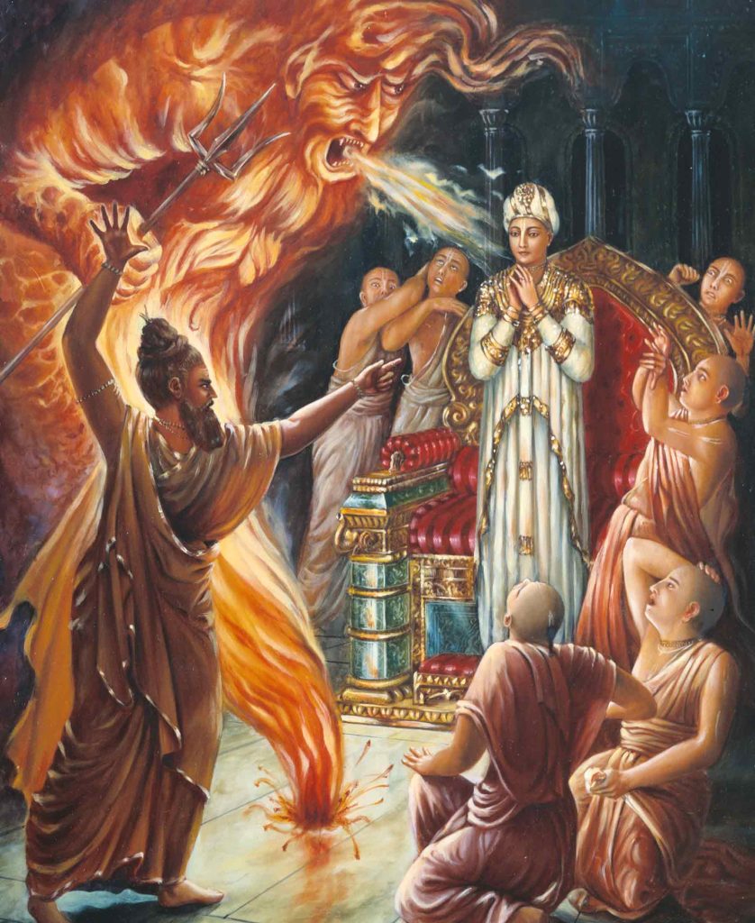 ನಿರಪರಾಧಿಯಾದ ಅಂಬರೀಷ ಮಹಾರಾಜನು ದೂರ್ವಾಸರಿಗೆ ಎಷ್ಟು ಸಮಾಧಾನ ಹೇಳಿದರೂ ಪ್ರಯೋಜನವಾಗಲಿಲ್ಲ. ಕೋಪಾವೇಶದ ಭರದಲ್ಲಿ ದೂರ್ವಾಸರು ತಮ್ಮ ತಲೆಯಿಂದ ಒಂದು ಕೂದಲನ್ನು ಮಂತ್ರಿಸಿ, ಅದು ಒಂದು ದೊಡ್ಡ ರಾಕ್ಷಸವಾಗುವಂತೆ ಮಾಡಿದರು. ಬೆಂಕಿಯ ಸ್ವರೂಪದ ಆ ಭಯಂಕರ ಭೂತವು ಅರಮನೆಯೇ ಅದುರುವಂತೆ ಕೂಗಿಡುತ್ತಾ ಕೈಯಲ್ಲಿ ತ್ರಿಶೂಲ ಹಿಡಿದು ರಾಜನನ್ನು ಕೊಲ್ಲಲು ಮುಂದಾಯಿತು. ಆಗ ಶ್ರೀಹರಿಯ ಪರಮ ಭಕ್ತನಾದ ಅಂಬರೀಷನು ಸ್ವಲ್ಪವೂ ಹೆದರಲಿಲ್ಲ. ನಿಂತ ಸ್ಥಳದಿಂದ ಕದಲಲೂ ಇಲ್ಲ. ಅವನು ಹರಿಯನ್ನು ಸ್ಮರಿಸುತ್ತಾ ನಿಂತುಬಿಟ್ಟ.