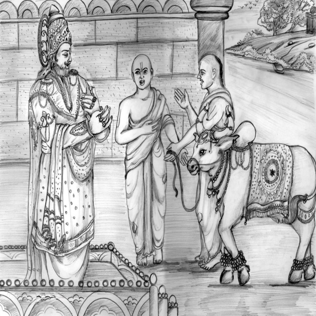 ಇಬ್ಬರೂ ಬ್ರಾಹ್ಮಣರು ಮಹಾರಾಜನ ಮೇಲೆ ಆರೋಪಿಸಿ, ಒಮ್ಮೆ ದಾನಮಾಡಿಕೊಟ್ಟ ಹಸುವನ್ನು ಹಿಂದಕ್ಕೆ ತೆಗೆದುಕೊಂಡು ಮತ್ತೆ ಇನ್ನೊಬ್ಬನಿಗೆ ದಾನ ಕೊಡುವುದು ಮಹಾ ಅಪರಾಧವೆಂದು ವಾದಿಸಿದರು. ಬ್ರಾಹ್ಮಣರ ಜೊತೆ ಈ ತರಹದ ವಂಚನೆಯ ವಹಿವಾಟು ಮಹಾರಾಜನಿಗೆ ಶೋಭೆಯನ್ನು ಕೊಡುವುದಿಲ್ಲ ಎಂದರು. ಈ ಪರಿಸ್ಥಿತಿಯ ಬಗ್ಗೆ ಅರಿವಿಲ್ಲದೆ ಮಹಾರಾಜನು ದಿಗ್ಭ್ರಾಂತನಾದನು.