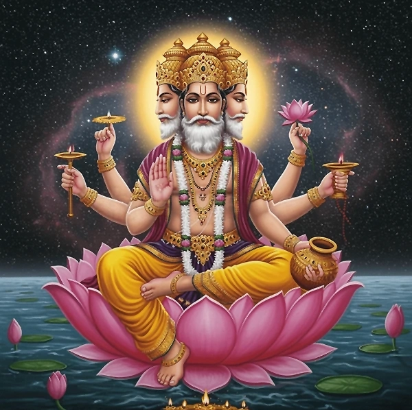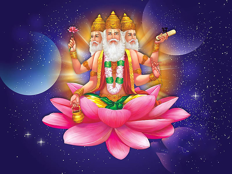 ಈ ಜಗದ ಸರ್ವೋಚ್ಚ ಆಡಳಿತಗಾರ. ಜಗತ್ತಿನ ಅತ್ಯಂತ ಶ್ರೇಷ್ಠ ಜೀವಿ. ಬ್ರಹ್ಮ ಎಂಬ ಪದದ ಅರ್ಥವೇ ಅದು ಎಲ್ಲವೂ ಯಾರಿಂದ ಸೃಷ್ಟಿಯಾಗಿದೆಯೋ ಅವನೇ ಬ್ರಹ್ಮ. ಹಾಗಾದರೆ ಬ್ರಹ್ಮನ ಸೃಷ್ಟಿ ಹೇಗಾಯಿತು? ಈ ಜಗತ್ತಿನ ಪ್ರಥಮ ಪುರುಷ ಕರ್ಣೋದಕಶಾಯಿ ವಿಷ್ಣು. ಆತನ ಚರ್ಮ ರೋಮಗಳಿಂದ ಅಸಂಖ್ಯಾತ ಬ್ರಹ್ಮಾಂಡಗಳು ಸೃಷ್ಟಿಯಾಗಿವೆ. ಪ್ರಥಮ ಪುರುಷನು ಗರ್ಭೋದಕಶಾಯಿ ವಿಷ್ಣುವಾಗಿ ಪ್ರತಿಯೊಂದು ಬ್ರಹ್ಮಾಂಡವನ್ನು ಪ್ರವೇಶಿಸುತ್ತಾನೆ. ಬ್ರಹ್ಮಾಂಡದ ಅರ್ಧಭಾಗ ಆತನ ದೇಹ ಜಲದಿ೦ದ ಆವೃತ್ತವಾಗಿದ್ದು, ಆತ ಅಲ್ಲೇ ನೆಲೆಸಿರುತ್ತಾನೆ. ಗರ್ಭೋದಕಶಾಯಿ ವಿಷ್ಣುವಿನ ನಾಭಿಯಿಂದ ಕಮಲ ಉದ್ಭವಿಸಿದ್ದು, ಅದೇ ಬ್ರಹ್ಮನ ಜನ್ಮಸ್ಥಳ. ಈ ಬ್ರಹ್ಮನೇ ಸಕಲ ಜೀವರಾಶಿಗಳ ತ೦ದೆ. ಎಲ್ಲಾ ದೇವಾನುದೇವತೆಗಳ ನಾಯಕ.