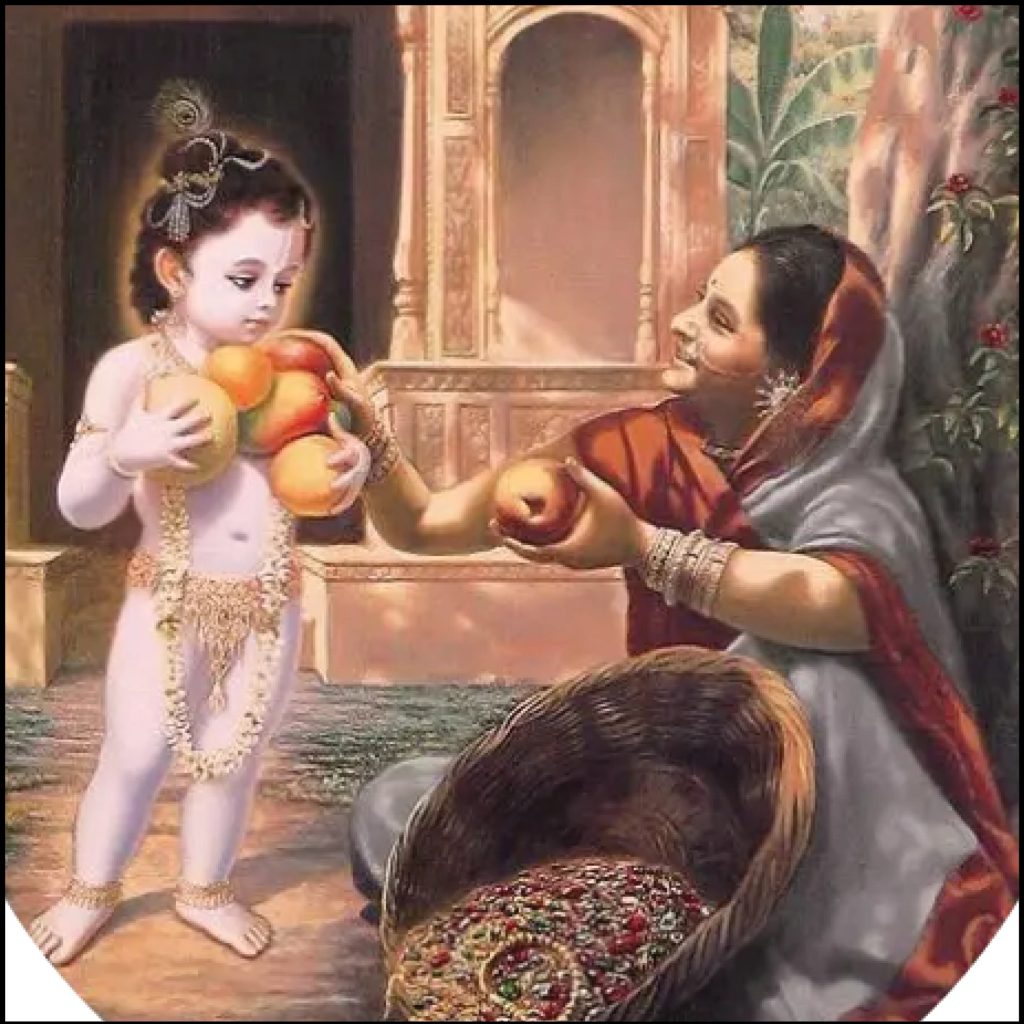 ಸರಿ, ಇನ್ನೇನು ಹಣ್ಣಿನವಳು ಹೊರಡಬೇಕು. ಆದ್ರೆ ಅವಳಿಗೆ ಕೃಷ್ಣನ್ನ ಬಿಟ್ಟು ಹೋಗ್ಲಿಕ್ಕೆ ಮನಸೇ ಇಲ್ಲ.ಕೊನೆಗೂ ಹೊರಟ್ಲು. ಬುಟ್ಟಿ ಎತ್ತಿ ತಲೆ ಮೇಲೆ ಇಟ್ಲೋಳಕ್ಕೆ ಹೋದ್ರೆ, ಬುಟ್ಟಿ ಎಲ್ಲ ಭಾರ ಭಾರ ಅನಿಸ್ಲಿಕ್ಕೆ ಶುರು ಆಯ್ತು. ಯಾಕೆ ಹೀಗಾಯ್ತು ಅಂತ ನೋಡಿದ್ರೆ… ಭಕ್ತ ಎಲ್ಲ ಬಂಗಾರ ಆಗಿಹೋಗಿತ್ತು! ಬುಟ್ಟಿ ತುಂಬ ಆಭರಣಗಳು ಥಳಥಳ ಹೊಳೀತಿದ್ವು!! ಕೃಷ್ಣ ಮಾತ್ರ ಏನೂ ಗೊತ್ತಿಲ್ಲದ ಮುಗ್ಧನ ಹಾಗೆ ಹಣ್ಣು ಮೆಲ್ತಾ ನಿಂತಿದ್ದ!