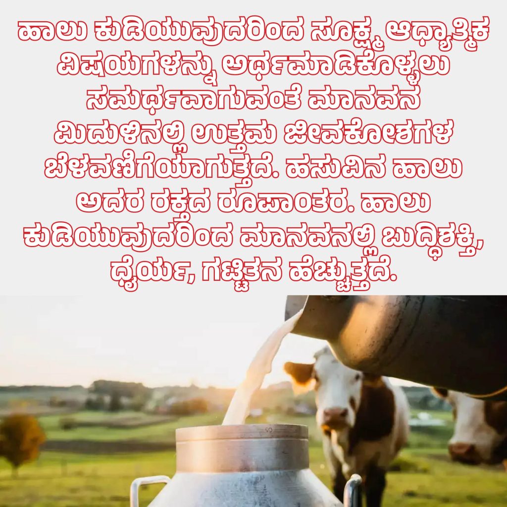 ಇವೆಲ್ಲದರ ಮೂಲ ಭೂತಾಯಿ ಮತ್ತು ಗೋಮಾತೆ. ಇದನ್ನು ಬಿಟ್ಟು ಮಾಂಸ, ಮೀನು, ಕಬ್ಬಿಣ, ಯಂತ್ರಗಳೇ ನಮ್ಮ ಜೀವನಾಧಾರ ಎಂದು ತಿಳಿಯುವುದು ಮೂರ್ಖತನ. ಹಾಲು ಕುಡಿಯುವುದರಿಂದ ಸೂಕ್ಷ್ಮ ಆಧ್ಯಾತ್ಮಿಕ ವಿಷಯಗಳನ್ನು ಅರ್ಥಮಾಡಿಕೊಳ್ಳಲು ಸಮರ್ಥವಾಗುವಂತೆ ಮಾನವನ ಮಿದುಳಿನಲ್ಲಿ ಉತ್ತಮ ಜೀವಕೋಶಗಳ ಬೆಳವಣಿಗೆಯಾಗುತ್ತದೆ. ಹಸುವಿನ ಹಾಲು ಅದರ ರಕ್ತದ ರೂಪಾ೦ತರ. ಹಾಲು ಕುಡಿಯುವುದರಿಂದ ಮಾನವನಲ್ಲಿ ಬುದ್ಧಿಶಕ್ತಿ ಧೈರ್ಯ, ಗಟ್ಟಿತನ ಹೆಚ್ಚುತ್ತದೆ.