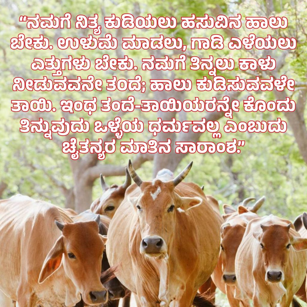 ಎತ್ತು ಮತ್ತು ಹಸುಗಳು ನಿಮ್ಮ ತಂದೆ- ತಾಯಿಗಳಿದ್ದಂತೆ. ಅದು ಹೇಗೆ ಅವುಗಳನ್ನು ಕೊ೦ದು ತಿನ್ನುತ್ತೀರಿ? ಇದೆಂಥ ಧಾರ್ಮಿಕ ತತ್ತ್ವ? ಯಾವ ಧೈರ್ಯದ ಮೇಲೆ ಇಂಥ ಪಾಪ ಕೃತ್ಯ ಎಸಗುತ್ತೀರಿ? ಇದು ಚೈತನ್ಯ ಮಹಾಪ್ರಭುಗಳು ಮುಸ್ಲಿಂ ಖಾಜಿಯೊಬ್ಬನನ್ನು ಕುರಿತು ಕೇಳಿದ ಪ್ರಶ್ನೆ. ಈಗ ಮತ್ತೆ ಈ ಪ್ರಶ್ನೆ ಕೇಳಬೇಕಾದ ಕಾಲ ಬಂದಿದೆ!