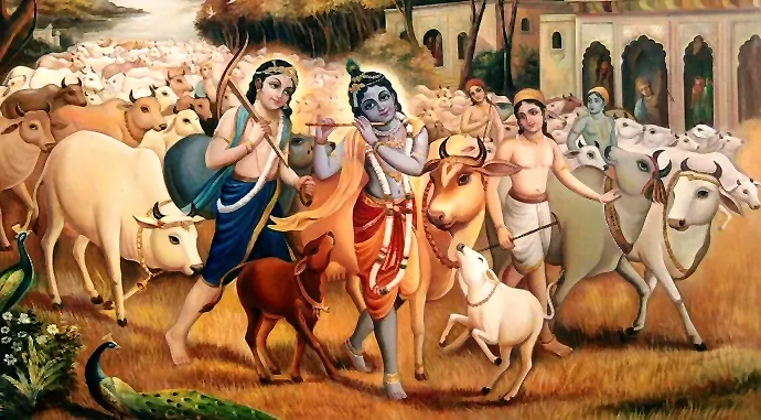 ಶ್ರೀಕೃಷ್ಣ- ಬಲರಾಮರು ‘ಪೌಗಂಡ’ ವಯೋಮಾನ (6 ರಿಂದ 10 ವರ್ಷ)ಕ್ಕೆ ಕಾಲಿಟ್ಟಾಗ ಸ೦ಪ್ರದಾಯದಂತೆ ವೃಂದಾವನದಲ್ಲಿ ಹಸುಗಳನ್ನು ಮೇಯಿಸುವ ಜವಾಬ್ದಾರಿ ವಹಿಸಲಾಗಿತ್ತು. ಗೋಪೂಜೆ ಸಂದರ್ಭದಲ್ಲಿ ಇದನ್ನು ಸಾಂಕೇತಿಕವಾಗಿ ಆಚರಿಸಲಾಗುತ್ತದೆ. ಕೃಷ್ಣ ಆಧ್ಯಾತ್ಮಿಕವಾಗಿ ತನ್ನ ವಯಸ್ಸಿನ ಇತರರಿಗಿಂತ ಹೆಚ್ಚು ಬೆಳೆದಿದ್ದಾನೆಂದು ತಿಳಿದ ಬಳಿಕ ನಂದ ಮಹಾರಾಜ ಅವನಿಗೆ ‘ಬಡ್ತಿ’ ನೀಡಿದ.