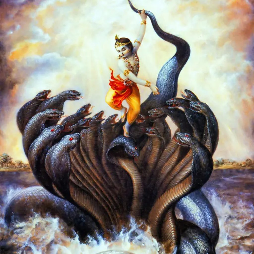 ಹೀಗೆ ಹೆಡೆಯನ್ನು ತನ್ನ ಕಾಲಿನಿಂದ ತುಳಿಯುವುದರೊಂದಿಗೆ, ಅದ್ಭುತವಾದ ನರ್ತನದ ನೋಟದೊಂದಿಗೆ ಶ್ರೀಕೃಷ್ಣ ಆ ಕಾಲಿಯ ಸರ್ಪದ ಒಂದು ಸಾವಿರ ಹೆಡೆಗಳನ್ನು ತುಳಿದು ಅಲುಗಾಡಿಸಿಬಿಟ್ಟಿದ್ದ, ಕಾಲಿಯ ಸರ್ಪದ ದೇಹ ನಜ್ಜುಗುಜ್ಜಾಗಿ ಹೋಗಿತ್ತು. ತನ್ನ ಬಾಯಿಗಳಿಂದ ರಕ್ತವನ್ನು ಕಾರುತ್ತ, ಕಾಲಿಯ ಕೊನೆಗೆ, ಈ ಕೃಷ್ಣನೇ ಮೂಲ ಪರಮ ಪುರುಷ, ಶ್ರೀ ನಾರಾಯಣ, ಎಲ್ಲ ಚರಾಚರ ವಸ್ತುಗಳ ಪರಮಗುರು ಎಂದು ಅರ್ಥಮಾಡಿಕೊಂಡು, ಶ್ರೀಕೃಷ್ಣನ ಕೃಪಾಕಟಾಕ್ಷಕ್ಕೆ ತಲೆಬಾಗಿದ.