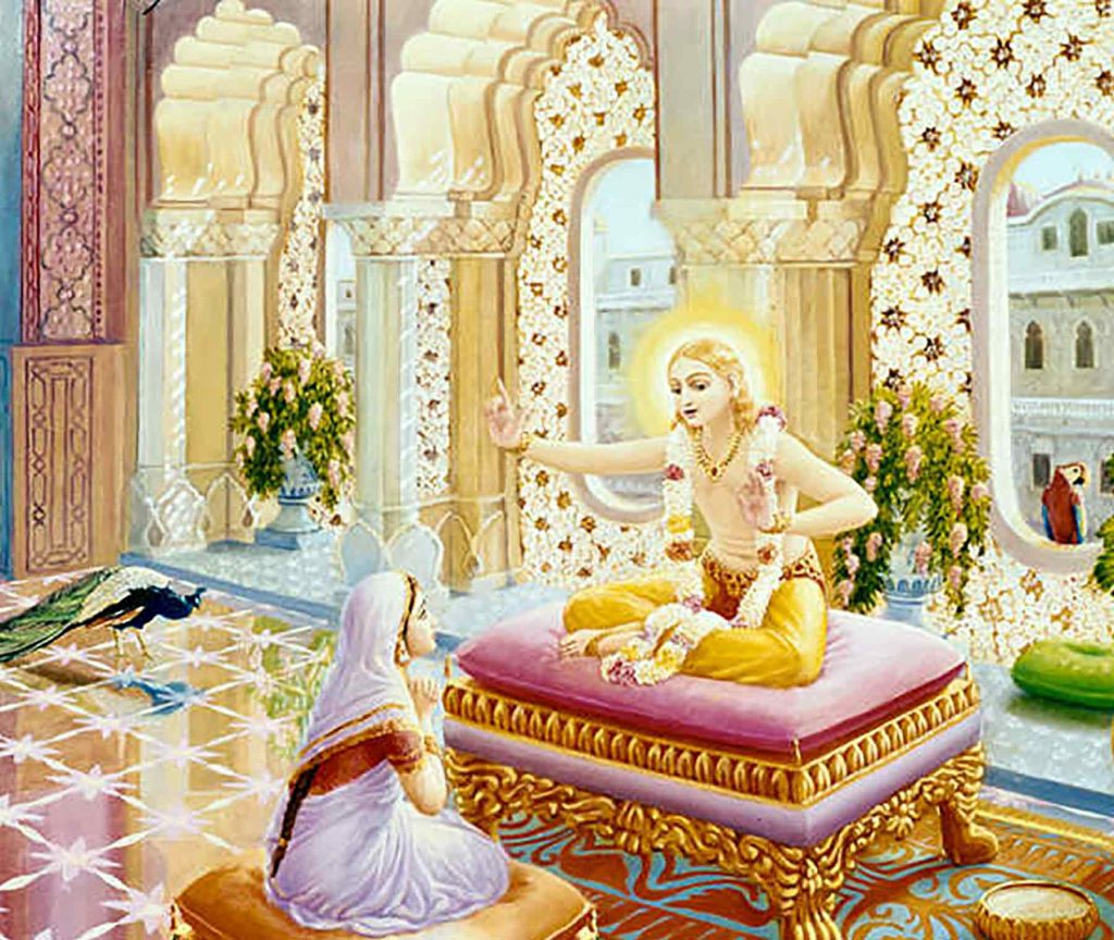 “ಅಮ್ಮಾ, ಭಗವಂತನಲ್ಲಿ ಭಕ್ತಿಯಿಲ್ಲದ ಗೃಹಸ್ಥರು ಕಾಮನೆಗಳ ಪೂರೈಕೆಗಾಗಿ ಅನೇಕ ಯಾಗಯಜ್ಞಗಳನ್ನು ಮಾಡುತ್ತಾ ದೇವತೆಗಳನ್ನೂ ಪಿತೃಗಳನ್ನೂ ಸಂತೃಪ್ತಗೊಳಿಸಿ ಅವರ ಲೋಕಗಳಿಗೆ ಹೋಗುತ್ತಾರೆ. ಆದರೆ ಮಹಾವಿಷ್ಣುವು ಆದಿಶೇಷನ ಮೇಲೆ ಮಲಗಿದಕೂಡಲೇ ಆ ಲೋಕಗಳೆಲ್ಲವೂ ನಾಶಹೊಂದುತ್ತವೆ! ಆದರೆ ಭಕ್ತರು ಫಲಾಪೇಕ್ಷೆಯಿಲ್ಲದೇ ತಮ್ಮ ಸ್ವಧರ್ಮವನ್ನು ಮಾಡುತ್ತಾ `ನಾನು’, `ನನ್ನದು’ ಎಂಬ ಅಹಂಕಾರ ತ್ಯಜಿಸಿ ಭಗವಂತನಲ್ಲೇ ಶರಣಾಗಿ ಅವನ ಬಳಿಗೇ ಹಿಂದಿರುಗುತ್ತಾರೆ. ಆದ್ದರಿಂದ ಅಮ್ಮಾ, ನೀನೂ ಭಕ್ತಿಯಿಂದ ಅವನ ಪಾದಾರವಿಂದಗಳನ್ನು ಸೇವಿಸು. ಶ್ರೀಕೃಷ್ಣನಲ್ಲಿ ಭಕ್ತಿ ತೋರುವುದರಿಂದ ಬಹಳ ಬೇಗನೆ ಜ್ಞಾನ, ವೈರಾಗ್ಯಗಳು ಪ್ರಾಪ್ತವಾಗಿ ಮುಕ್ತಿ ದೊರೆಯುತ್ತದೆ.