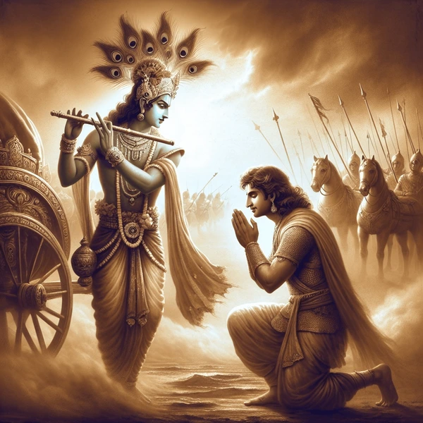 ಕುರುಕ್ಷೇತ್ರ ಸಮರ ಭೂಮಿಯಲ್ಲಿ ಕೃಷ್ಣನು ಕಾಲಾತೀತ ಜ್ಞಾನವಾದ ಭಗವದ್ಗೀತೆಯನ್ನು ಬೋಧಿಸಿದನು. ಅರ್ಜುನ‌ ಮತ್ತು ಇತರ ಮಾನವ ಸಮುದಾಯಕ್ಕೆ ಭಯ, ಗೊಂದಲ ಮತ್ತು ಸಂಕಷ್ಟವನ್ನು ಶ್ರದ್ಧೆ, ಕರ್ತವ್ಯ‌ ಮತ್ತು ಪ್ರೀತಿಯ ಭಕ್ತಿಯ ಮೂಲಕ ಎದುರಿಸಿ ಗೆಲ್ಲಬಹುದೆನ್ನವುದನ್ನು ಸಾರಿದನು.
