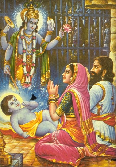 ದೇವಕಿ ತನ್ನ ಎಂಟನೆಯ ಮಗುವಿನ ನಿರೀಕ್ಷೆಯಲ್ಲಿದ್ದಾಗ ವಿಚಿತ್ರವಾದ ನಿಶ್ಶಬ್ದತೆ ಮತ್ತು ಪ್ರಶಾಂತತೆ ಮಥುರೆಯನ್ನು ಆವರಿಸಿಕೊಂಡಿತು. ಮಧ್ಯರಾತ್ರಿಯ ವೇಳೆಗೆ ಪ್ರಕಾಶಮಾನವಾದ ಬೆಳಕು ಸೆರೆಮನೆಯಲ್ಲಿ ಹರಡಿತು. ಶ್ರೀ ವಿಷ್ಣುವು ಚತುರ್ಭುಜನಾಗಿ ದೇವಕಿ ಮತ್ತು ವಸುದೇವರ ಮುಂದೆ ಪ್ರತ್ಯಕ್ಷನಾದನು. ಅವನ ಕರಗಳಲ್ಲಿ ಶಂಖ, ಚಕ್ರ, ಗದೆ ಮತ್ತು ಕಮಲ ಪುಷ್ಪಗಳಿದ್ದವು.