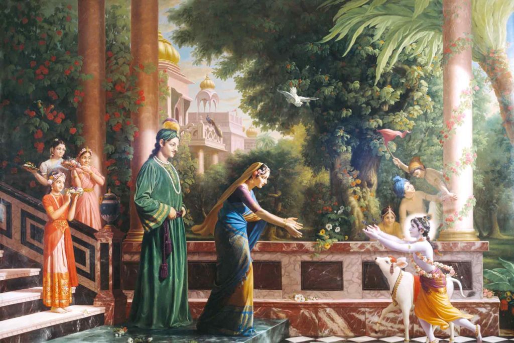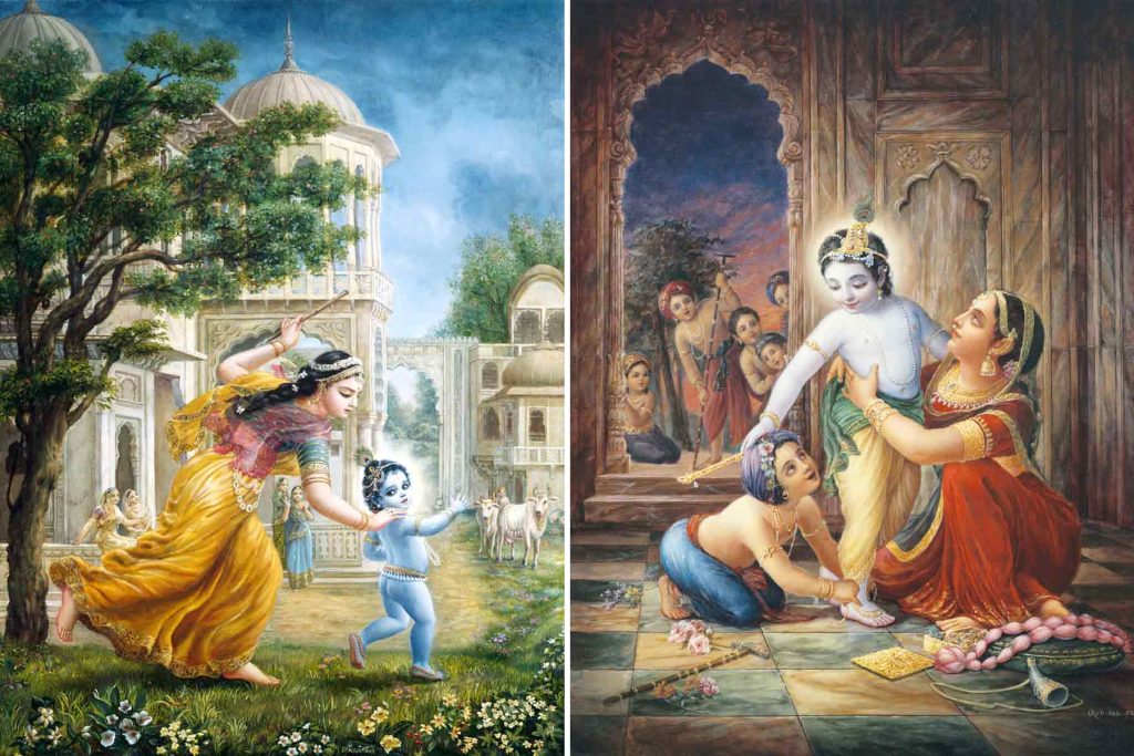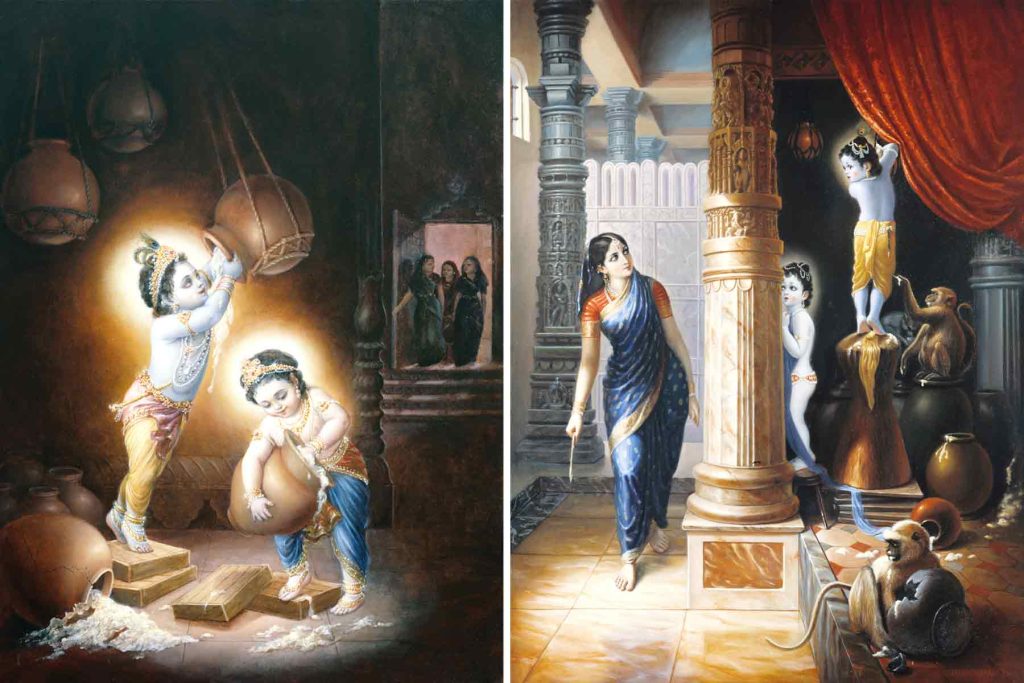 ಯಶೋದೆ ಮತ್ತು ರೋಹಿಣಿಯರ ಗೆಳತಿಯರಾದ ಗೋಪಿಯರು ಒಂದು ಕಡೆ ಕೃಷ್ಣ ಬಲರಾಮರ ತುಂಟ ಬಾಲಲೀಲೆಗಳಿಂದ ಒಂದು ರೀತಿಯ ಅಲೌಕಿಕ ಆನಂದವನ್ನು ಪಡೆಯುತ್ತಿದ್ದರು. ಇನ್ನೊಂದು ಕಡೆ ಒಂದು ಜಾಗದಲ್ಲಿ ಇರಲೊಲ್ಲದ ಈ ಬಾಲಕರ ಮೇಲೆ ದೂರು ಕೊಡಲು ತಾಯಿ ಯಶೋದೆಯ ಬಳಿಗೆ ಹೋಗುತ್ತಿದ್ದರು. ಒಮ್ಮೆ ಕೃಷ್ಣನು ತಾಯಿ ಯಶೋದೆಯ ಮುಂದೆ ಕುಳಿತಿದ್ದಾಗ ಗೋಪಿಯರೆಲ್ಲ ಬಂದು ಅವನಿಗೆ ಕೇಳುವಂತೆಯೇ ದೂರು ಹೇಳಲಾರಂಭಿಸಿದರು… “ಪ್ರಿಯ ಯಶೋದೆ, ನಿನ್ನ ತುಂಟ ಕೃಷ್ಣನನ್ನು ಅಂಕೆಯಲ್ಲಿ ಏಕೆ ಇಟ್ಟುಕೊಳ್ಳುವುದಿಲ್ಲ? ಪ್ರತಿ ದಿನ ಬೆಳಿಗ್ಗೆ ಮತ್ತು ಸಂಜೆ ಕೃಷ್ಣ ಬಲರಾಮರು ನಮ್ಮ ಮನೆಗಳಿಗೆ ಬರುತ್ತಾರೆ. ಹಸುಗಳ ಹಾಲು ಕರೆಯುವ ಮೊದಲೇ ಕರುಗಳನ್ನು ಬಿಟ್ಟು ಬಿಡುತ್ತಾರೆ. ಕರುಗಳು ಹಾಲನ್ನೆಲ್ಲಾ ಕುಡಿದು ಬಿಡುವುದರಿಂದ ನಮಗೆ ಕರೆಯಲು ಹಾಲು ಇರುವುದೇ ಇಲ್ಲ. ನಾವು ಬರಿಯ ಪಾತ್ರೆಗಳನ್ನು ಹಿಡಿದು ಕೊಂಡು ಹಿಂತಿರುಗಬೇಕಾಗುತ್ತದೆ. ಹೀಗೆಲ್ಲಾ ಮಾಡಬೇಡಿ ಎಂದು ಹೇಳಿದರೆ ಅವರು ಮೋಹಕವಾಗಿ ನಕ್ಕು ಬಿಡುತ್ತಾರೆ ಅಷ್ಟೇ. ಆಗ ನಮಗೇನೂ ಮಾಡಲಾಗುವುದಿಲ್ಲ. ನಾವು ಮೊಸರು ಬೆಣ್ಣೆಗಳನ್ನು ಎಲ್ಲಿಯೇ ಇಡಲಿ ಅದನ್ನು ಕದಿಯುವುದೆಂದರೆ ಅವರಿಗೆ ಬಹಳ ಆನಂದ. ಹಾಗೆ ಕದಿಯುವಾಗ ಸಿಕ್ಕಿಬಿದ್ದರೆ `ನಾವು ಕದಿಯುತ್ತೇವೆ ಎಂದು ಏಕೆ ಆಪಾದನೆ ಹೊರಿಸುವಿರಿ. ನಮ್ಮ ಮನೆಯಲ್ಲಿ ಸಾಕಷ್ಟು ಮೊಸರು ಬೆಣ್ಣೆ ಇಲ್ಲ ಎಂದು ಕೊಂಡಿದ್ದೀರೇನು?’ ಎಂದು ಕೇಳುತ್ತಾರೆ.