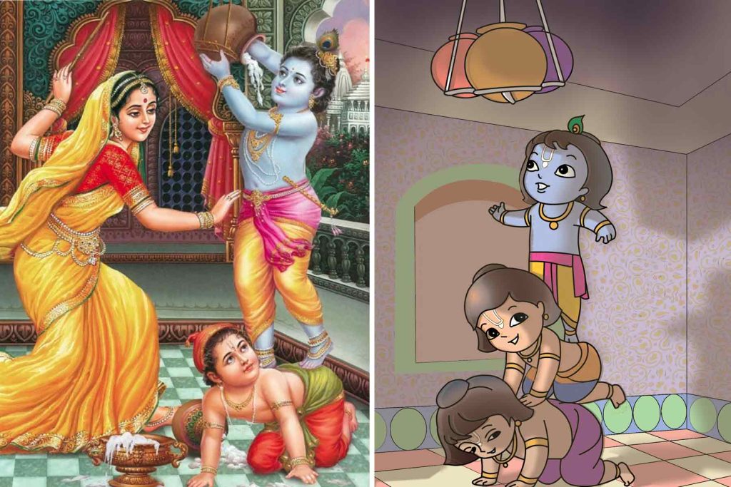 ಆಗ ಕೃಷ್ಣನ ಕೈಮೇಲೆ ಬಿತ್ತು, ಬೆಣ್ಣೆ! ತಲೆ ಎತ್ತಿ ನೋಡಿದರೆ, ಬೆಣ್ಣೆಯ ಮಡಕೆಗಳನ್ನು ತೂಗುಹಾಕಿರುವುದು ಕಂಡಿತು. ಕೃಷ್ಣನ ಕಳ್ಳ ಬುದ್ಧಿ ಗೊತ್ತಿದ್ದ ಪ್ರಭಾವತಿ ಬೆಣ್ಣೆ ಮಡಕೆಯನ್ನು ಎತ್ತರದಲ್ಲಿ ತೂಗು ಹಾಕಿದ್ದಳು, ಆ ಎತ್ತರಕ್ಕೆ ಕೃಷ್ಣ ಹತ್ತಲಾರನೆಂಬ ನಂಬಿಕೆಯಿಂದ. ಆದರೆ ಎಷ್ಟೇ ಎತ್ತರದಲ್ಲಿರಲಿ ಬೆಣ್ಣೆಯನ್ನು ಪಡೆಯಲೇಬೇಕೆಂಬ ದೃಢ ಸಂಕಲ್ಪ ಮಾಡಿದ್ದ ಕೃಷ್ಣ ಮತ್ತು ಮಿತ್ರರು, ಉಪಾಯ ಮಾಡತೊಡಗಿದರು. ಅಲ್ಲಿದ್ದ ಡಬ್ಬಗಳನ್ನು ಒಂದರಮೇಲೊಂದರಂತೆ ಇಟ್ಟರೂ ಅಷ್ಟು ಮೇಲೇರಲಾಗಲಿಲ್ಲ.