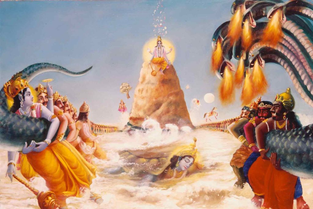 ಬಹಳ ಹಿಂದಿನ ಮಾತು. ದಾಯಾದಿಗಳಾದ ದೇವ-ದಾನವರಿಗೆ ತಮ್ಮ ತಮ್ಮಲ್ಲೇ ವೈರವುಂಟಾಯಿತು. ಅದರಿಂದಾಗಿ ಎರಡೂ ಗುಂಪುಗಳ ನಡುವೆ ಆಗಾಗ ಯುದ್ಧವು ಸಂಭವಿಸುತ್ತಿತ್ತು. ದೈವ ವಿರೋಧಿಗಳಾದ ದಾನವರ ಕಿರುಕುಳ ದೇವತೆಗಳಿಗೆ ಹೆಚ್ಚಾಯಿತು. ಒಮ್ಮೆ ನಡೆದ ಭೀಕರ ಕಾಳಗದಲ್ಲಿ ದೇವತೆಗಳು ಅತಿಯಾದ ಸಾವು ನೋವುಗಳನ್ನು ಅನುಭವಿಸಿ ದಿಕ್ಕುಗಾಣದೆ ಬ್ರಹ್ಮನ ಬಳಿಗೆ ಹೋಗಿ ತಮ್ಮ ಅಳಲನ್ನು ಹೇಳಿಕೊಂಡರು. ಅವನ ಸಲಹೆಯಂತೆ ಎಲ್ಲ ದೇವತೆಗಳೂ ಭಗವಂತನಾದ ವಿಷ್ಣುವಿನ ಬಳಿ ಸಾರಿ ಅವನಿಗೆ ಶರಣಾಗಿ ಪ್ರಾರ್ಥಿಸತೊಡಗಿದರು. ಅವರ ಪ್ರಾರ್ಥನೆಯಂತೆ ಪ್ರಸನ್ನನಾದ ಭಗವಂತನು ದಾನವರ ರಾಜನಾದ ಬಲಿಚಕ್ರವರ್ತಿಯೊಂದಿಗೆ ಸಂಧಾನ ಮಾಡಿಕೊಂಡು ಸಮುದ್ರ ಮಂಥನ ಮಾಡಿದಲ್ಲಿ ಅಮೃತ ಲಭಿಸುವುದೆಂದೂ ಅದನ್ನು ಸೇವಿಸುವುದರಿಂದ ಅಮರರಾಗಬಹುದೆಂದೂ ಭಗವಂತನು ದೇವತೆಗಳಿಗೆ ತಿಳಿಸಿದನು.