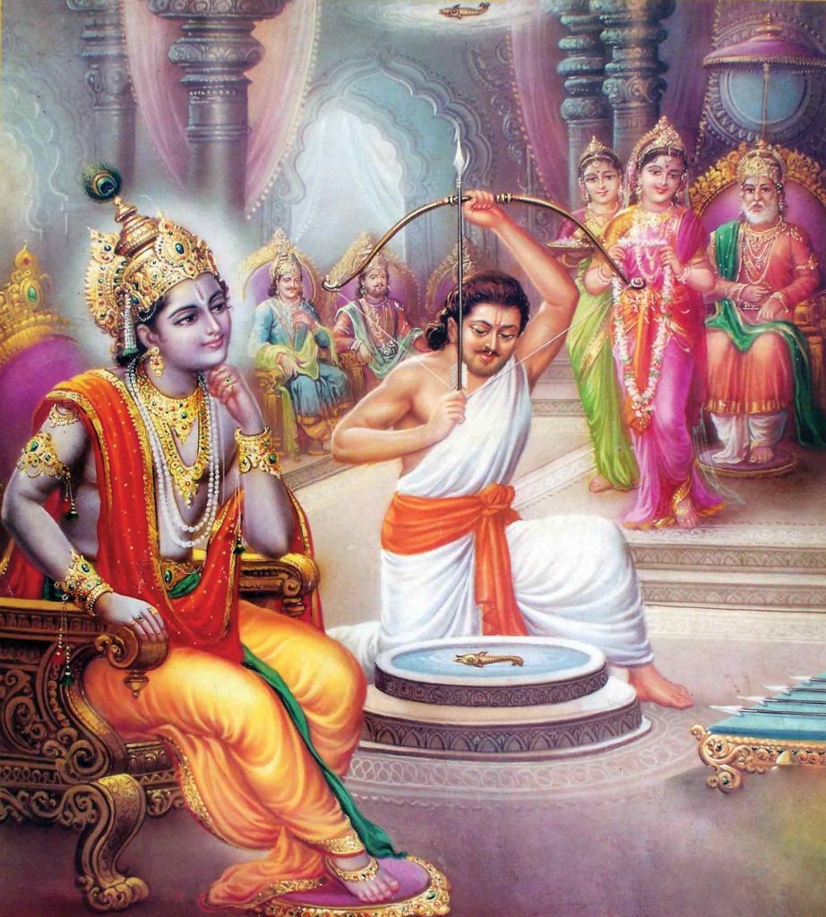 ದ್ರೌಪದಿಯು ಪಾಂಡವರಲ್ಲಿ ಅತ್ಯಂತ ಕುಶಲ ಬಿಲ್ಲುಗಾರನಾಗಿದ್ದ ಅರ್ಜುನನನ್ನು ವರಿಸುವ ಅಪೇಕ್ಷೆ ಹೊಂದಿದ್ದಳು. ಆದುದರಿಂದ ಅವಳ ತಂದೆಯು ಅರ್ಜುನನಂತಹ ಶ್ರೇಷ್ಠರಷ್ಟೇ ಸಾಧಿಸಬಹುದಾದ ಅತ್ಯಂತ ಕಠಿಣವಾದ ಪರೀಕ್ಷೆಯನ್ನು ಯೋಜಿಸಿದ್ದರು. ಅರಮನೆಯ ಎತ್ತರದ ಛಾವಣಿಯ ಬಳಿ ನೇತಾಡುತ್ತಿದ್ದ ಮೀನು ಪರೀಕ್ಷಾರ್ಥಿಯ ಗುರಿಯಾಗಿತ್ತು. ಅದರ ಕೆಳಗೆ ಚಕ್ರವೊಂದನ್ನು ತೂಗುಹಾಕಲಾಗಿತ್ತು. ಸ್ವಯಂವರದಲ್ಲಿ ಭಾಗಿಯಾಗುವ ಬಿಲ್ಲುಗಾರನು ಈ ರಕ್ಷಣಾ ಚಕ್ರದ ಅರೆಗಳ (ಕಂಬಿ) ಮೂಲಕ ಮೀನಿನ ಕಣ್ಣನ್ನು ಚುಚ್ಚಬೇಕಾಗಿತ್ತು. ಅದಕ್ಕಿಂತ ಹೆಚ್ಚಾಗಿ, ಅವನು ಅದನ್ನು ತನ್ನ ಗುರಿಯತ್ತ ನೋಡದೆಯೇ ಮಾಡಬೇಕಾಗಿತ್ತು! ನೆಲದ ಮೇಲೆ ಒಂದು ನೀರಿನ ಪಾತ್ರೆಯನ್ನು ಇಡಲಾಗಿತ್ತು. ಅದರಲ್ಲಿ ಚಕ್ರ ಮತ್ತು ಮೀನಿನ ಪ್ರತಿಬಿಂಬವನ್ನು ನೋಡಬಹುದಿತ್ತು. ಸ್ಪರ್ಧಿಯು ತೊಯ್ದಾಡುತ್ತಿದ್ದ ನೀರಿನಲ್ಲಿ ನೋಡುತ್ತ ಗುರಿಯತ್ತ ಬಾಣ ಪ್ರಯೋಗಿಸಬೇಕಾಗಿತ್ತು. ಬಡ ಬ್ರಾಹ್ಮಣನ ವೇಷದಲ್ಲಿದ್ದ ಅರ್ಜುನನು ತನ್ನ ಗುರಿಯನ್ನು ಸಾಧಿಸಿದಾಗ ಎಲ್ಲರೂ ಅಚ್ಚರಿಗೊಂಡರು. ಸ್ಪರ್ಧಿಗಳಾಗಿದ್ದ ಇತರ ರಾಜಕುಮಾರರು ತೀವ್ರ ಪ್ರತಿರೋಧ ತೋರಿದರೂ ಅರ್ಜುನನು ಅವರನ್ನೆಲ್ಲ ಬದಿಗೊತ್ತಿ ಪರಾಜಯಗೊಳಿಸಿದನು ಮತ್ತು ದ್ರೌಪದಿಯ ಕೈ ಹಿಡಿದನು.