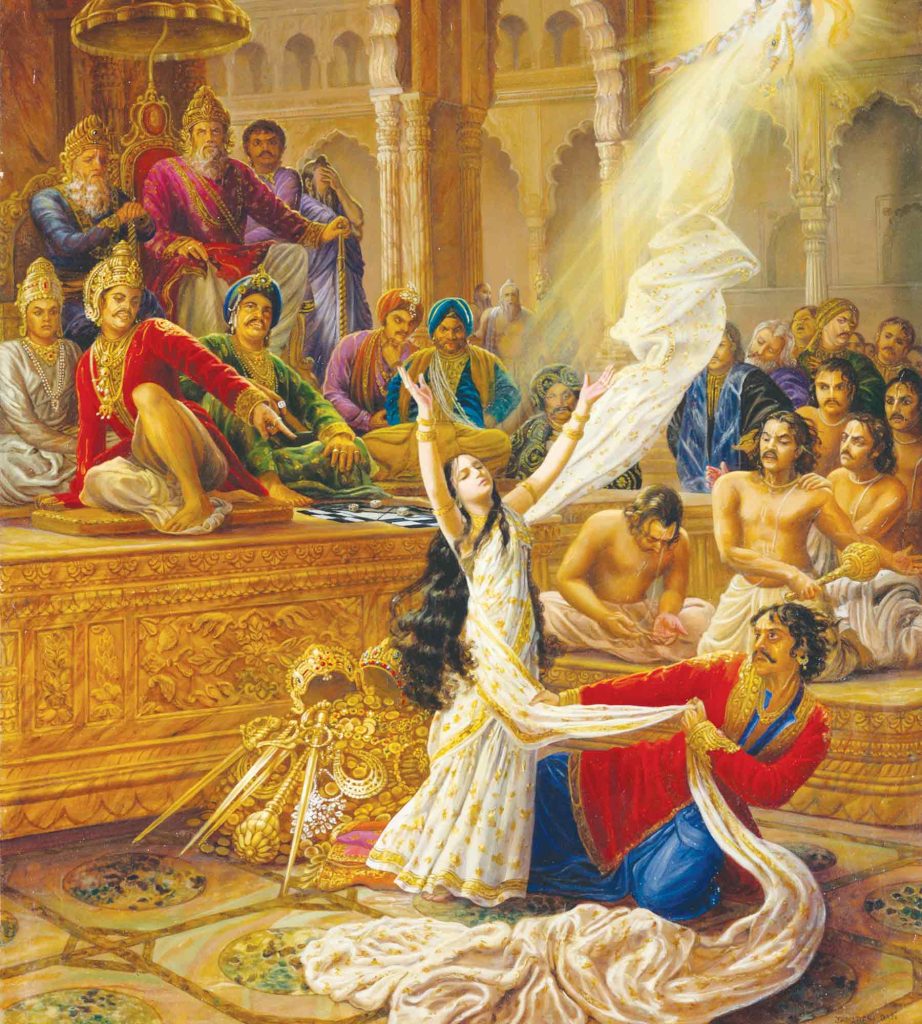 ಈ ಘಟನೆ ನಡೆದ ಕೆಲವೇ ದಿನಗಳ ಅನಂತರ ಧೃತರಾಷ್ಟ್ರನು ಜೂಜಾಟಕ್ಕಾಗಿ ಯುಧಿಷ್ಠಿರನಿಗೆ ಆಹ್ವಾನ ಕಳುಹಿಸಿದನು. ಈ ಜೂಜಾಟವನ್ನು ತನ್ನನ್ನು ನಾಶಪಡಿಸುವ ಉದ್ದೇಶದಿಂದಲೇ ವ್ಯವಸ್ಥೆ ಮಾಡಲಾಗಿದೆ ಎಂದು ಅರಿತಿದ್ದ ಯುಧಿಷ್ಠಿರನು ಅಸಂತೋಷದಿಂದಲೇ ಸವಾಲನ್ನು ಸ್ವೀಕರಿಸಿದನು. ರಾಜಕುಮಾರನಾಗಿ ಅವನು ಅದನ್ನು ನಿರಾಕರಿಸುವುದು ಸಾಧ್ಯವಿರಲಿಲ್ಲ. ಯುಧಿಷ್ಠಿರನೊಂದಿಗೆ ಪಗಡೆ ಆಟವಾಡಲು ದುರ್ಯೋಧನನು ಕುಖ್ಯಾತ ಮೋಸಗಾರ ಶಕುನಿಯನ್ನು ಕೇಳಿದನು. ಆಟದ ಆರಂಭದಲ್ಲಿಯೇ ಯುಧಿಷ್ಠಿರನಿಗೆ ಶಕುನಿಯ ಮೋಸದಾಟ ಅರ್ಥವಾಯಿತು. ಆದರೆ ನೈತಿಕತೆಯು ಅವನಿಗೆ ಆಟವನ್ನು ಮುಂದುವರಿಸುವಂತೆ ಮಾಡಿತು. ಶಕುನಿಯು ಅವನ ಸಂಪತ್ತು, ಸಾಮ್ರಾಜ್ಯ ಮತ್ತು ಪತ್ನಿ ದ್ರೌಪದಿಯನ್ನೂ ಗೆದ್ದುಕೊಂಡನು. ಅತ್ಯಂತ ನೋವಿನ ಸಂಗತಿ ಎಂದರೆ ದುರ್ಯೋಧನನ ಸೋದರ ದುಶ್ಯಾಸನನು ಸಭೆಯಲ್ಲಿ ನೆರೆದಿದ್ದ ಯೋಧರ ಮುಂದೆ ದ್ರೌಪದಿಯನ್ನು ವಿವಸ್ತ್ರಗೊಳಿಸಲು ಪ್ರಯತ್ನಿಸಿದ್ದು. ಈ ಕೃತ್ಯವು ಪತಿವ್ರತೆಯಾದ ರಾಣಿ ಮತ್ತು ವೀರರಾದ ಅವಳ ಪತಿಯರಿಗೆ ಎಷ್ಟು ದಿಗ್ಭ್ರಮೆ ಉಂಟುಮಾಡಿರಬಹುದು ಎನ್ನುವುದನ್ನು ನಮಗೆ ಊಹಿಸಿಕೊಳ್ಳುವುದೂ ಸಾಧ್ಯವಿಲ್ಲ. ಅಸಹಾಯಕಳಾದ ದ್ರೌಪದಿಯು ದೇವೋತ್ತಮ ಶ್ರೀ ಕೃಷ್ಣನನ್ನು ಪ್ರಾರ್ಥಿಸಿಕೊಂಡಳು. ದುಶ್ಶಾಸನನು ಅವಳನ್ನು ಅಪಮಾನಿಸದಿರುವಂತೆ ಕೃಷ್ಣನು ತನ್ನ ದೈವೀ ಶಕ್ತಿಯಿಂದ ಅವಳಿಗೆ ಸೀರೆಯನ್ನು ಪೂರೈಸುತ್ತಲೇ ಇದ್ದನು. ಈ ದೃಶ್ಯವು ಕಾಲ ಕ್ರಮೇಣ ಕುರುಕ್ಷೇತ್ರ ಸಮರವಾಗಿ ಬೆಳೆಯುವ ಬೀಜವಾಯಿತು.