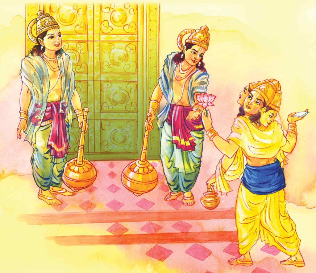ಅಲ್ಲಿ ಸೇರಿದ ಅಗಣಿತವಾದ ಬ್ರಹ್ಮರು ಮತ್ತು ವಿವಿಧ ದೇವತೆಗಳ ಕಿರೀಟಗಳೆಲ್ಲವೂ ಆ ಮಹಾಸಭೆಯಲ್ಲಿ ಬೆಳಗುತ್ತಿದ್ದವು. ದೇವತೆಗಳ ಪ್ರಾರ್ಥನಾ ಘೋಷ ಆ ಸಭಾಭವನದಲ್ಲಿ ಭಾರಿ ನಿನಾದವನ್ನು ಮೂಡಿಸಿತು.