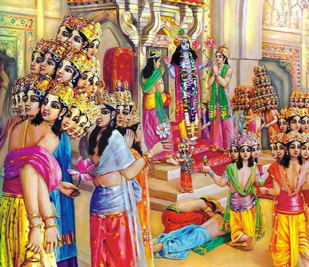 ಬ್ರಹ್ಮನ ಈ ಮಾತನ್ನು ಕೇಳಿದ ಕೃಷ್ಣನು ನಸುನಕ್ಕು, ಬ್ರಹ್ಮನನ್ನು ತನ್ನ ಸಭಾಮಂಟಪಕ್ಕೆ ಕರೆದೊಯ್ದು ಉಚಿತವಾದ ಆಸನದಲ್ಲಿ ಕುಳ್ಳಿರಿಸಿ, ಸ್ವಲ್ಪ ಸಮಯ ಅಲ್ಲಿ ನಡೆಯುವ ವಿದ್ಯಮಾನಗಳನ್ನು ವೀಕ್ಷಿಸುವಂತೆ ತಿಳಿಸಿದ. ವಿವಿಧ ಬ್ರಹ್ಮಾಂಡಗಳ ಬೇರೆ ಬೇರೆ ಬ್ರಹ್ಮರನ್ನೆಲ್ಲಾ ತಾನಿದ್ದಲ್ಲಿಗೆ ಬರಮಾಡಿಕೊಂಡ. ಚತುರ್ಮುಖ ಬ್ರಹ್ಮ ನೋಡು ನೋಡುತ್ತಿದ್ದಂತೆಯೇ ಅನೇಕ ಬ್ರಹ್ಮರು ಬಂದು ಶ್ರೀ ಕೃಷ್ಣನಿಗೆ ಪಾದಾಭಿವಂದನೆ ಮಾಡಲು ಪ್ರಾರಂಭಿಸಿದರು. ಹಾಗೆ ಬಂದ ಬ್ರಹ್ಮರಲ್ಲಿ ಕೆಲವರು ಹತ್ತು ಮುಖಗಳನ್ನು ಹೊಂದಿದ್ದರೆ ಕೆಲವರಿಗೆ ಇಪ್ಪತ್ತು ಕೆಲವರಿಗೆ ಶತಮುಖಗಳು ಮತ್ತೆ ಕೆಲವರಿಗೆ ದಶಲಕ್ಷ ಮುಖಗಳು ಕೂಡಾ ಇದ್ದವು. ವಾಸ್ತವವಾಗಿ ಇದು ಎಲ್ಲಿಗೆ ಮುಟ್ಟಿತೆಂದರೆ, ಕೃಷ್ಣನಿಗೆ ನಮಸ್ಕರಿಸುತ್ತಿದ್ದ ಬ್ರಹ್ಮರ ಸಂಖ್ಯೆಯನ್ನು ಎಣಿಸುವುದು ಕೂಡಾ ಚತುರ್ಮುಖ ಬ್ರಹ್ಮನಿಗೆ ಸಾಧ್ಯವಾಗದೆ ಹೋಯಿತು. ಬಳಿಕ ಬೇರೆ ಬೇರೆ ಬ್ರಹ್ಮಾಂಡಗಳ ದೇವತೆಗಳೆಲ್ಲಾ ಅಲ್ಲಿಗೆ ಬಂದು ಶ್ರೀಕೃಷ್ಣನಿಗೆ ಭಕ್ತಿಯಿಂದ ನಮಿಸಿದರು.