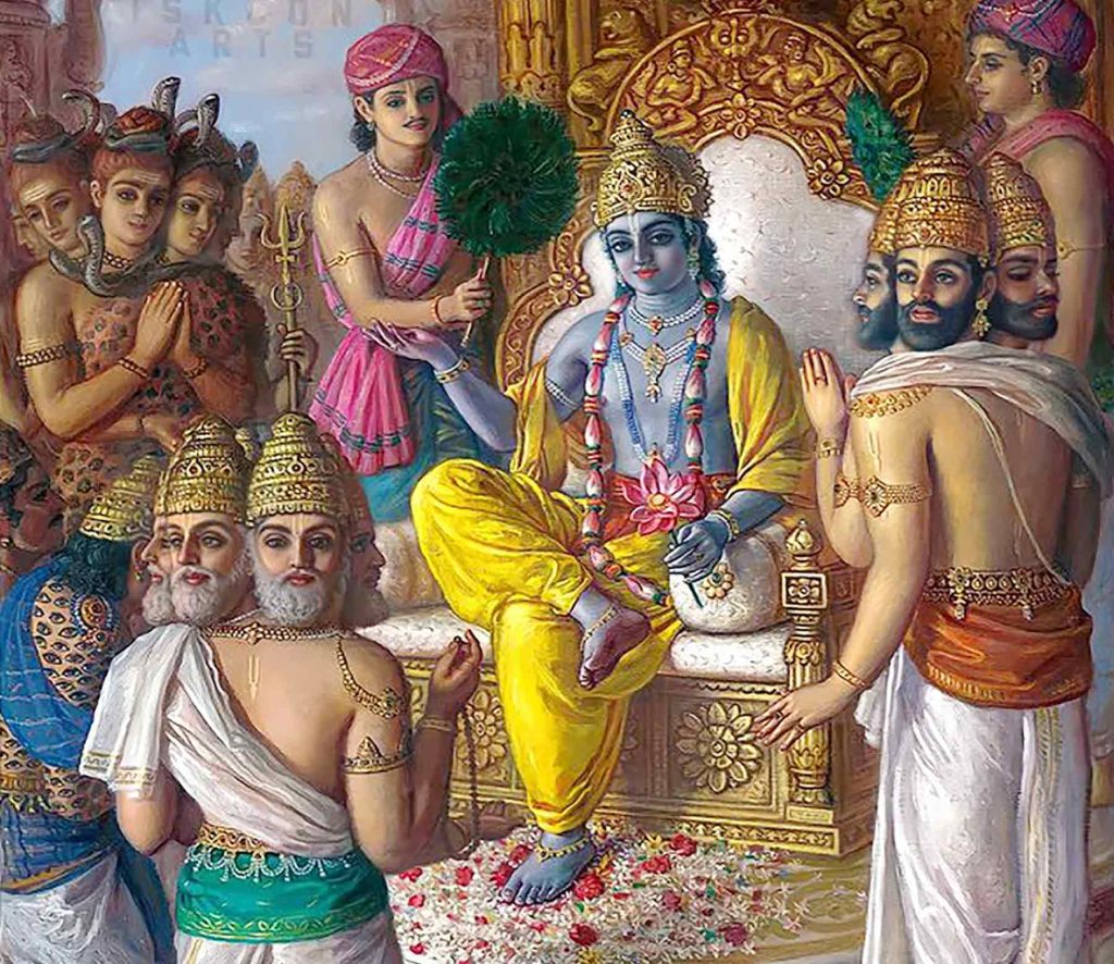 ದೇವತೆಗಳು, “ಪ್ರಿಯ ಪ್ರಭುವೇ, ನಿನ್ನ ಅಪಾರವಾದ ಕರುಣೆಯು ನಮ್ಮನ್ನಿಲ್ಲಿಗೆ ಬರಮಾಡಿಕೊಂಡಿದೆ. ನಮ್ಮಿಂದ ಆಗಬೇಕಾದ ಕಾರ್ಯವೇನಾದರೂ ಇದೆಯೇ? ಅಪ್ಪಣೆಯಾದಲ್ಲಿ ಅದನ್ನು ಈಗಲೇ ಮಾಡಿ ಮುಗಿಸುತ್ತೇವೆ”, ಎಂದು ಬಿನ್ನವಿಸಿಕೊಂಡರು. ಇದನ್ನು ಕೇಳಿದ ಶ್ರೀಕೃಷ್ಣ, “ಸದ್ಯದಲ್ಲಿ ನಿಮ್ಮಿಂದ ಆಗಬೇಕಾದ ಕಾರ್ಯ ಯಾವುದೂ ಇಲ್ಲ. ನಿಮ್ಮನ್ನೆಲ್ಲಾ ಒಂದು ಸಾರಿ ಒಟ್ಟಿಗೆ ನೋಡಬೇಕೆನ್ನಿಸಿತು. ನಿಮಗೆಲ್ಲಾ ಶುಭ ಕಾಮನೆಗಳು. ಹೋಗಿ ಬನ್ನಿ. ಅಸುರರಿಗೆ ಅಂಜಬೇಡಿ” ಎಂದನು. “ನಿನ್ನ ಅನುಗ್ರಹದಿಂದಾಗಿ ಎಲ್ಲವೂ ಸುಗಮವಾಗಿಯೇ ಇವೆ. ಸದ್ಯದಲ್ಲಿ ಎಲ್ಲಿಯೂ ಗದ್ದಲ ಗಲಭೆಗಳಿಲ್ಲ. ನಿನ್ನ ಅವತಾರದಿಂದಾಗಿ ಅಮಂಗಳಕರವಾದವುಗಳು ಎಲ್ಲವೂ ಇಲ್ಲವಾಗಿವೆ”, ಎಂದು ಮತ್ತೆ ಬಿನ್ನವಿಸಿಕೊಂಡರು.