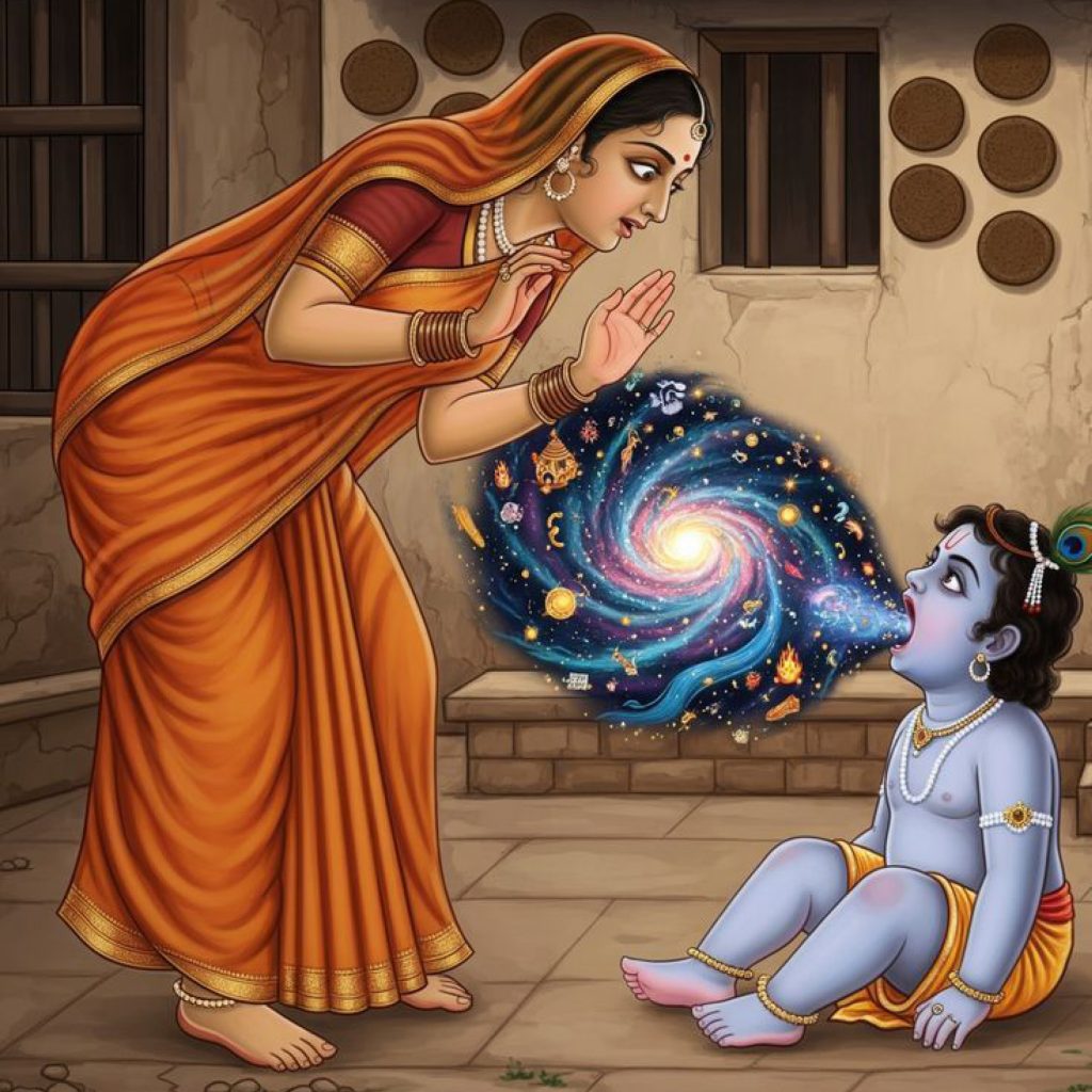ಒಮ್ಮೆ ಕೃಷ್ಣನ ಗೆಳೆಯರು ಅವನ ತಾಯಿಯ ಬಳಿ, ಕೃಷ್ಣ ಮಣ್ಣು ತಿಂದನೆಂದು ದೂರಿದರು. ಆದರೆ ಕೃಷ್ಣ ಅದನ್ನು ಅಲ್ಲಗಳೆದ. ಅವನ ತಾಯಿ ಅವನನ್ನು ಬಾಯಿ ತೆರೆಯಲು ಹೇಳಿದಳು. ಕೃಷ್ಣ ಅದರಂತೆ ಬಾಯ್ತೆರೆದಾಗ ಯಶೋದೆಯು ಅಲ್ಲಿ ಇಡಿಯ ಸೃಷ್ಟಿಯನ್ನು ಪಂಚಭೂತಗಳನ್ನು, ಎಲ್ಲ ಬಗೆಯ ಜೀವಿಗಳನ್ನು ಕಂಡಳು. ಜೊತೆಗೆ ತನ್ನ ಮಡಿಲಲ್ಲಿ ತನ್ನ ಮಗುವನ್ನು ಕೂರಿಸಿಕೊಂಡಿರುವ ತನ್ನನ್ನೂ ಅಲ್ಲಿ ಕಂಡಳು!