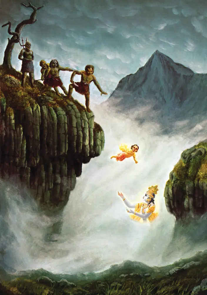 ಅದಕ್ಕೂ ಮೊದಲು ಆತ ಪ್ರಹ್ಲಾದನನ್ನು ಕರೆದು ತೊಡೆ ಮೇಲೆ ಕೂರಿಸಿಕೊಂಡ. ಗುರುಕುಲದಲ್ಲಿ ಯಾವ ಪಾಠ ಕಲಿಯುತ್ತಿರುವೆ ಮಗೂ?’ ಎಂದು ಪ್ರೀತಿಯಿಂದಲೇ ಪ್ರಶ್ನಿಸಿದ ‘ಐಹಿಕ ಸುಖದ ಪೊಳ್ಳುತನ ಮತ್ತು ಬುದ್ಧಿವಂತರು ಭಗವಂತನ ಸೇವೆಯಲ್ಲಿ ತೊಡಗಬೇಕಾದ ಅವಶ್ಯಕತೆ ಏನು ಎಂಬುದನ್ನು ಕಲಿತುಕೊಳ್ಳಲು ಪ್ರಯತ್ನಿಸುತ್ತಿದ್ದೇನೆ ಅಪ್ಪಾಜಿ’ ಎಂದು ಪ್ರಹ್ಲಾದ ಮುಗ್ಧವಾಗಿ ಉತ್ತರಿಸಿದ.