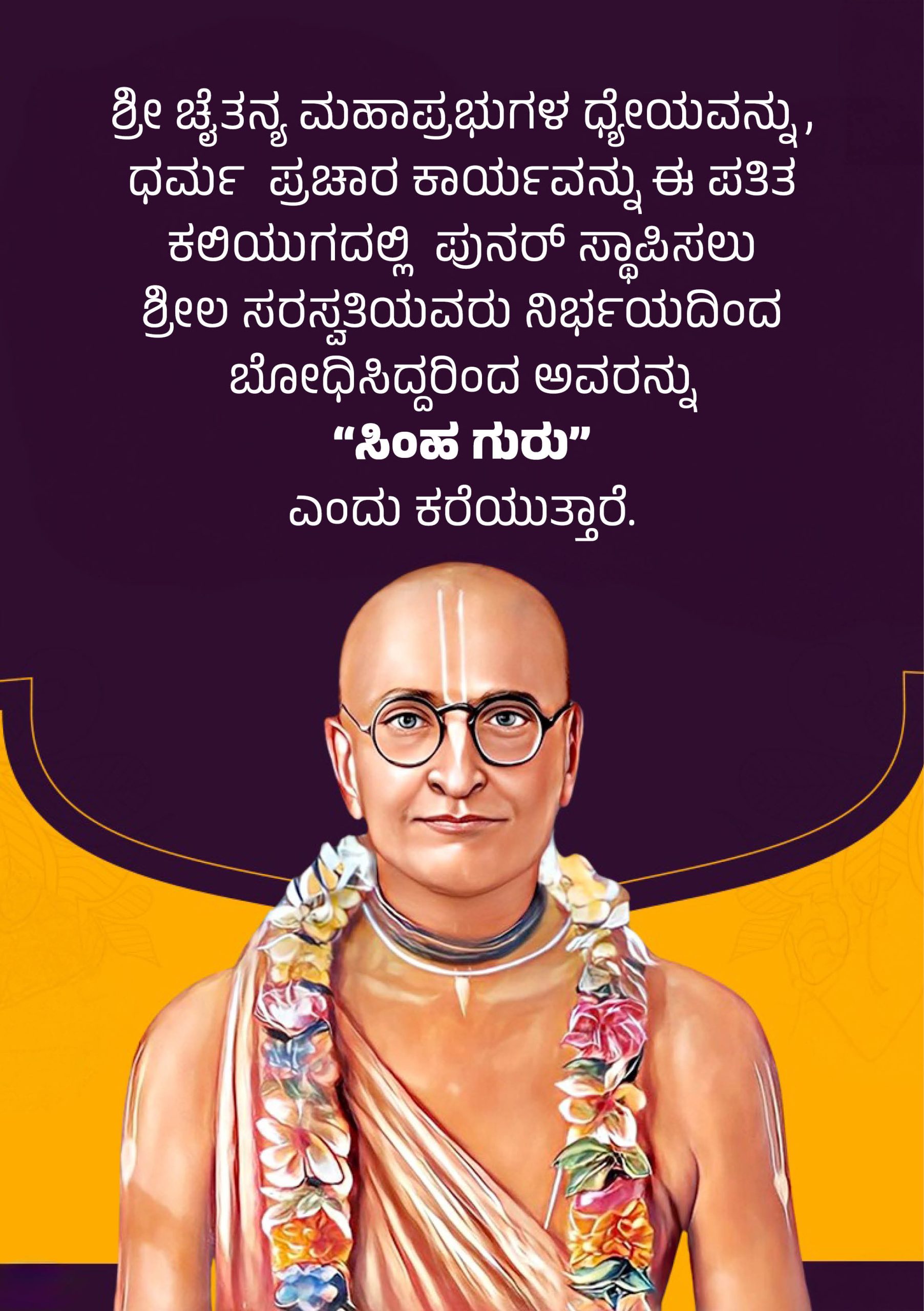 ಶ್ರೀ ಚೈತನ್ಯ ಮಹಾಪ್ರಭುಗಳ ಧ್ಯೇಯವನ್ನು, ಧರ್ಮ ಪ್ರಚಾರ ಕಾರ್ಯವನ್ನು ಈ ಪತಿತ ಕಲಿಯುಗದಲ್ಲಿ ಪುನರ್ ಸ್ಥಾಪಿಸಲು ಶ್ರೀಲ ಸರಸ್ವತಿಯವರು ನಿರ್ಭಯದಿಂದ ಬೋಧಿಸಿದ್ದರಿಂದ ಅವರನ್ನು “ಸಿಂಹ ಗುರು” ಎಂದು ಕರೆಯುತ್ತಾರೆ. ಅವರ ಶಿಷ್ಯ ಪರಂಪರೆಯ ಭಕ್ತರು ಅವರನ್ನು ಆಧ್ಯಾತ್ಮಿಕ ಲೋಕದಲ್ಲಿ ಶ್ರೀ ಚೈತನ್ಯರ ಶಾಶ್ವತ ಸಹವರ್ತಿಗಳೆಂದು ಗೌರವಿಸುತ್ತಾರೆ.