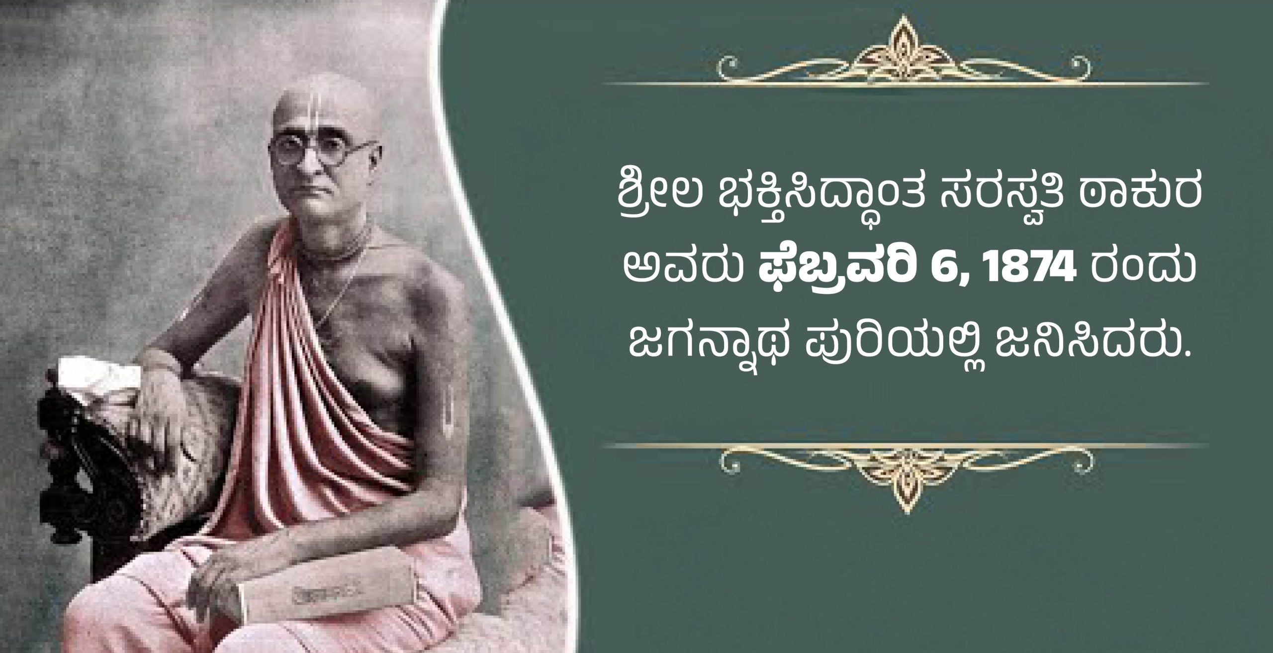 ಶ್ರೀಲ ಭಕ್ತಿವೇದಾಂತ ಸ್ವಾಮಿ ಪ್ರಭುಪಾದರ ಆಧ್ಯಾತ್ಮಿಕ ಗುರು ಶ್ರೀಲ ಭಕ್ತಿಸಿದ್ಧಾಂತ ಸರಸ್ವತಿ ಠಾಕುರ ಅವರು ಫೆಬ್ರವರಿ 6, 1874 ರಂದು ಜಗನ್ನಾಥ ಪುರಿಯಲ್ಲಿ ಜನಿಸಿದರು. ಅವರ ತಂದೆ ಶ್ರೀಲ ಭಕ್ತಿವಿನೋದ ಠಾಕುರರು, ದೊಡ್ಡ ಸರ್ಕಾರಿ ಅಧಿಕಾರಿಯಾಗಿದ್ದರು. ಅಂದರೆ ಮ್ಯಾಜಿಸ್ಟ್ರೇಟರಾಗಿದ್ದರು. ಅದು ಗೌರ್ನರ್ ನಂತರದ ಸ್ಥಾನ. ಭಕ್ತಿವಿನೋದ ಠಾಕುರರು ಜಗನ್ನಾಥ ಮಂದಿರದ ನಿರ್ವಹಣೆಯನ್ನೂ ವಹಿಸಿಕೊಂಡಿದ್ದರು. ಆಗ ಅವರ ಹೆಸರು ಕೇದಾರನಾಥ ದತ್ತ, ಕೆ.ಎನ್. ದತ್ತ.