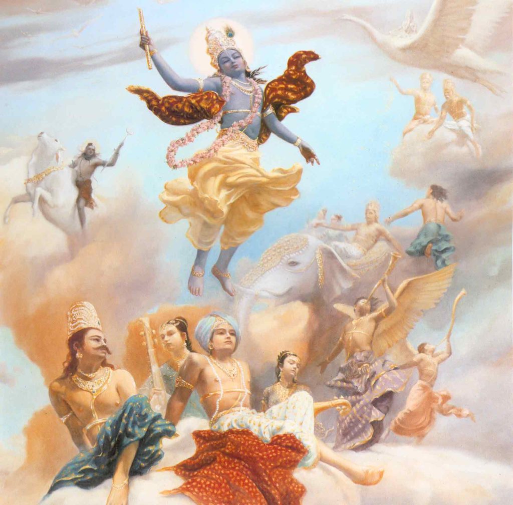 ಹಾಗೆಯೇ, ಕೃಷ್ಣ, ಪ್ರಭು ಸರ್ವೋತ್ತಮ, ಸರ್ವಶಕ್ತನಾದುದರಿಂದ ಆತ ವೈಯಕ್ತಿಕವಾಗಿ ಕೆಲಸ ಮಾಡಬೇಕಾಗಿಲ್ಲ. ಆತ ಸದಾ ವೇಣುವಾದನ ನಿರತ ಮತ್ತು ಗೋಪಿನೃತ್ಯವಿಲಾಸಿ. ಅಷ್ಟೆ. ಆನಂದಮಯೋಽಭ್ಯಾಸಾತ್ ಆತ ಸುಮ್ಮನೆ ಆನಂದಾನುಭವದಲ್ಲಿರುತ್ತಾನೆ.