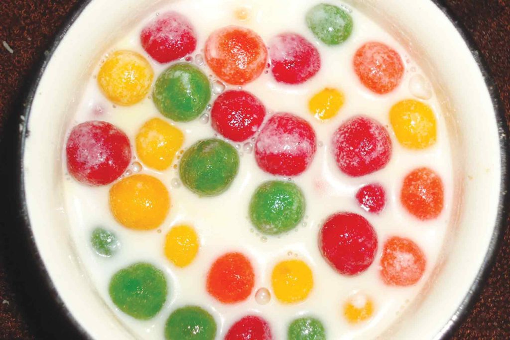 ನಾಲ್ಕು ಕಪ್ ಹಾಲನ್ನು ತೆಗೆದುಕೊಂಡು ಕಾಯಲು ಇಡಿ. ಇದು ಮೂರು ಕಪ್ ಆಗುವಂತೆ ಕಾಯಿಸಿ. ಇದಕ್ಕೆ ಕಾರ್ನ್ಫ್ಲೋರ್ನ್ನು ಸ್ವಲ್ಪ ನೀರಿನಲ್ಲಿ ಬೆರೆಸಿ ಹಾಕಿ. ಆಗ ಹಾಲು ಗಟ್ಟಿಯಾಗುತ್ತದೆ. ಅನಂತರ ಇದಕ್ಕೆ ಉಳಿದ ಸಕ್ಕರೆ, ಬಾದಾಮಿ ಪುಡಿ ಹಾಕಿ. ಇದರ ಮೇಲೆ ಬಣ್ಣ ಬಣ್ಣದ ಉಂಡೆಗಳನ್ನು ಹಾಕಿ ಕುದಿಸಿ. ಒಂದು ಕುದಿ ಬಂದ ಅನಂತರ ಕೆಳಗಿಳಿಸಿ ಆರಿದ ಅನಂತರ ಈ ಖೀರನ್ನು ಗಾಜಿನ ಲೋಟಗಳಲ್ಲಿ ಹಾಕಿಕೊಡಿ. ಖೀರಿನಲ್ಲಿ ಉಂಡೆಗಳು ಆಕರ್ಷಕವಾಗಿ ಕಾಣುವುದರಿಂದ ಮಕ್ಕಳು ಇಷ್ಟಪಟ್ಟು ತಿನ್ನುತ್ತಾರೆ.