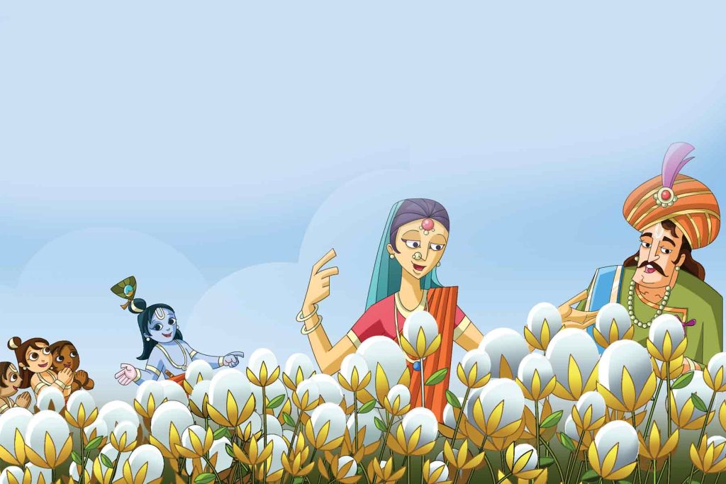 ಆದರೆ ತಾನು ಮುತ್ತು ಬೆಳೆಯಬಲ್ಲೆ ಎಂಬ ವಿಶ್ವಾಸ ಕೃಷ್ಣನಿಗೆ ಇತ್ತು. ಆದುದರಿಂದ ಅವನು ತನ್ನ ತಾಯಿ ಯಶೋದೆ ಬಳಿಗೆ ಹೋಗಿ ಸ್ವಲ್ಪ ಮುತ್ತುಗಳನ್ನು ಬೇಡಿದ, ಅದನ್ನು ಬಿತ್ತುವುದಾಗಿ ಹೇಳಿದ. ಯಶೋದಾಗೆ ಇದು ತಮಾಷೆಯಾಗಿ ಕಂಡರೂ ಅವಳು ಮಗನಿಗೆ ಏನನ್ನೂ ನಿರಾಕರಿಸದ ಕಾರಣ ತನ್ನ ಕೆಲವು ಮುತ್ತುಗಳನ್ನು ಕೃಷ್ಣನಿಗೆ ನೀಡಿದಳು.