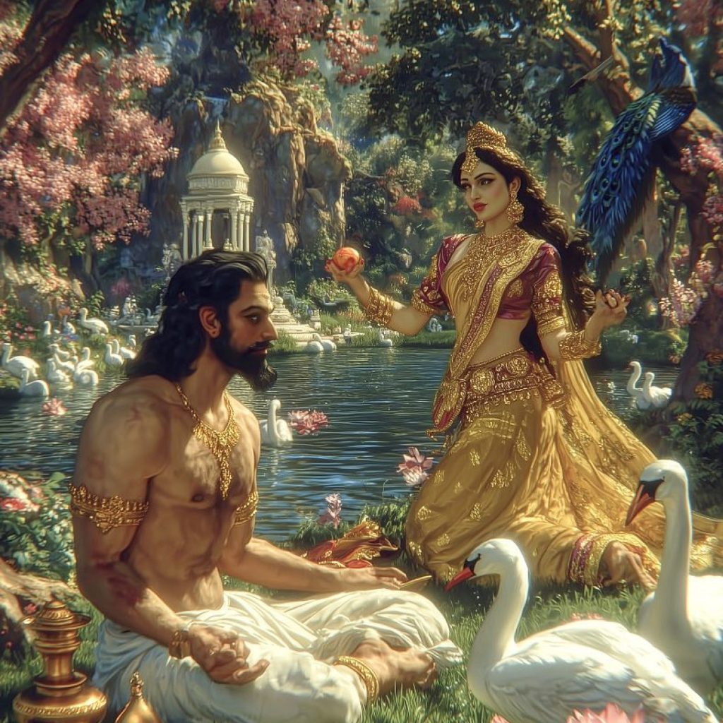 ಆಗಾಗ ಅಲ್ಲಿಗೆ ದೇವತಾಸ್ತ್ರೀಯರೂ ಅಪ್ಸರೆಯರೂ ಗಂಧರ್ವ ಕಿನ್ನರರೂ ಬಂದು ಪ್ರಕೃತಿಯ ರಮ್ಯತೆಯನ್ನು ಸವಿಯುತ್ತಿದ್ದರು; ಅಂದದ ಸುಮಗಳ ಸುಗಂಧವನ್ನು ಹೊತ್ತು ಬೀಸುತ್ತಿದ್ದ ತಂಗಾಳಿಯ ತಂಪನ್ನು ಅನುಭವಿಸುತ್ತಾ ಆನಂದದಿಂದ ವಿಹರಿಸುತ್ತಿದ್ದರು! ಅರಳಿದ ಕೆಂದಾವರೆಗಳಿಂದ ಅಲಂಕರಿಸಲ್ಪಟ್ಟಿದ್ದ ಶೀತಲ ಜಲದ ರಮ್ಯ ಸರೋವರಗಳಲ್ಲಿ ಮತ್ತೆ ಮತ್ತೆ ಜಲಕೇಳಿಯಾಡಿ ಮುದಗೊಳ್ಳುತ್ತಿದ್ದರು!