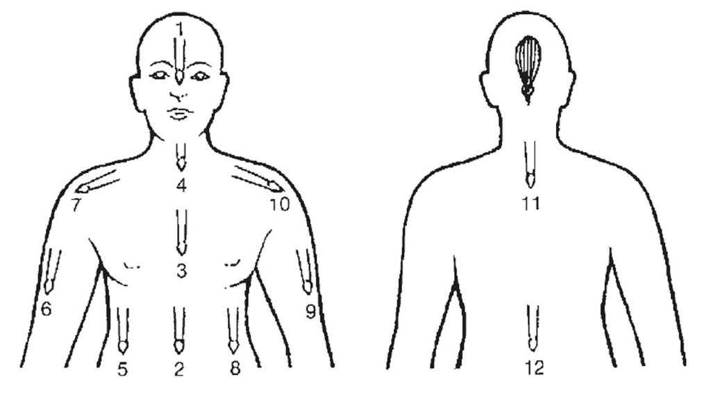 ನಿಮ್ಮ ಬಲಗೈ ಉಂಗುರದ ಬೆರಳಿನಿಂದ ತಿಲಕವನ್ನು ಹಾಕಿಕೊಳ್ಳಿ. ನಿಮ್ಮ ಹುಬ್ಬುಗಳ ನಡುವಣ ಜಾಗದಷ್ಟು ಅಗಲವಾಗಿ ಹಣೆಯಲ್ಲಿ ಗುರುತು ಮಾಡಿಕೊಳ್ಳಿ. ಎರಡು ಲಂಬ ರೇಖೆಗಳನ್ನು ರೂಪಿಸಲು ಬಹುಶಃ ಕಿರು ಬೆರಳನ್ನು ಉಪಯೋಗಿಸಿ ಮಧ್ಯದಲ್ಲಿ ಸ್ಪಷ್ಟ ಜಾಗವನ್ನು ಮಾಡಿಕೊಳ್ಳಿ. ಈ ಗೆರೆಗಳು ಸೊಟ್ಟಗಾದರೆ, ನೀವು ಮೂರನೆಯ ಬೆರಳನ್ನು ಉಪಯೋಗಿಸಿ ಅದನ್ನು ನೇರ ಗೆರೆ ಮಾಡಬಹುದು. ಈಗ ಎಲೆ ಆಕಾರದ ಗುರುತು ಮಾಡಿ. ಹಣೆಗೆ ತಿಲಕ ಹಾಕಿಕೊಂಡ ಮೇಲೆ ದೇಹದ ಉಳಿದ 11 ಭಾಗಗಳಲ್ಲಿ ತಿಲಕವನ್ನು ಹಾಕಿಕೊಳ್ಳುತ್ತಿದ್ದಂತೆಯೇ ವಿಷ್ಣುವಿನ ಸೂಕ್ತ ಹೆಸರುಗಳನ್ನು ಹೇಳುತ್ತ ತಿಲಕವನ್ನು ಧರಿಸಿ, ಓಂ ಕೇಶವಾಯ ನಮಃ ಎಂದರೆ “ಓ ನನ್ನ ದೇವರೇ, ಕೇಶವ, ನಾನು ನಿನಗೆ ನನ್ನ ಗೌರವಪೂರ್ಣ ಪ್ರಣಾಮಗಳನ್ನು ಸಲ್ಲಿಸುವೆ.” ಹೀಗೆ ನಾವು ನಮ್ಮ ದೇಹದಲ್ಲಿ ಚಿಹ್ನೆ ಹಾಕಿಕೊಳ್ಳುತ್ತಿದ್ದಂತೆ ನಾವು ಅವನ ಹೆಸರುಗಳಲ್ಲಿ 12 ಅನ್ನು ಹೇಳುತ್ತೇವೆ.