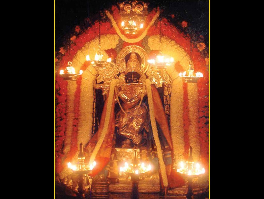 ಚತುರ್ಭುಜ, ಅಭಯ ಹಸ್ತ ಮತ್ತು ಪದ್ಮ ಹಸ್ತದೊಂದಿಗಿನ ಅಮ್ಮನವರ ಮೂಲ ವಿಗ್ರಹಕ್ಕೆ ಗುಂಡ್ಲುಪೇಟೆಯ ತೆರಕಣಾಂಬಿಯಲ್ಲಿನ ಪುರಾತನ ದೇವಾಲಯದಲ್ಲಿ ಕ್ರಮಬದ್ಧವಾಗಿ ಪೂಜೆ ನಡೆಯುತಿತ್ತು. 1829 ರಲ್ಲಿ ಈ ವಿಗ್ರಹವು ಮೈಸೂರು ಸಂಸ್ಥಾನವನ್ನು ಮುಟ್ಟಿತು. ಅರಮನೆಯ ಅಧಿಕಾರಿ ಶ್ರೀ ಶ್ರೀಕಂಠರಾಜೇ ಅರಸು ಅವರ ನೆರವಿನಿಂದ ಮಹಾರಾಣಿಯು ತಮ್ಮ ಒಪ್ಪಿಗೆ ಸೂಚಿಸಿದ ಮೇಲೆ ವಿಗ್ರಹವನ್ನು ಈ ದೇವಸ್ಥಾನಕ್ಕೆ ಸ್ಥಳಾಂತರಿಸಲಾಯಿತು.