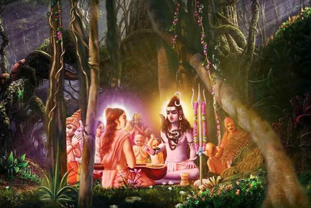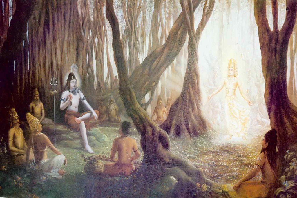 ಇಂಥ ಮನೋಹರ ತಾಣಗಳನ್ನು ನೋಡಿ ಮುನ್ನಡೆದ ದೇವತೆಗಳು ಒಂದು ದೊಡ್ಡ ವಟವೃಕ್ಷವನ್ನು ಕಂಡರು. ಆ ವಟವೃಕ್ಷವು ನೂರು ಯೋಜನಗಳಷ್ಟು ಎತ್ತರವಾಗಿದ್ದು ಶಾಖೋಪಶಾಖೆಗಳನ್ನು ಎಪ್ಪತ್ತೈದು ಯೋಜನಗಳಷ್ಟು ದೂರ ವಿಸ್ತರಿಸಿಕೊಂಡಿತ್ತು! ಯಾವಾಗಲೂ ಆ ಮರದ ನೆರಳಿನಿಂದ ಕೂಡಿದ್ದ ಆ ಸ್ಥಳ ಬಹು ತಂಪಾಗಿತ್ತು. ಹಕ್ಕಿ ಪಕ್ಷಿಗಳ ಗದ್ದಲವಿರದೆ ಪ್ರಶಾಂತವಾಗಿತ್ತು. ಯೋಗಿಗಳಿಗೆ ಪರಮಾಶ್ರಯವೂ, ಸಕಲರಿಗೂ ಮೋಕ್ಷಪ್ರದವೂ ಆಗಿದ್ದ ಆ ಮಹಾವೃಕ್ಷದ ಕೆಳಗೆ, ಸನಕಸನಂದಾದಿ ಕುಮಾರರಿಂದಲೂ ಯಕ್ಷೇಶ್ವರನಾದ ಕುಬೇರನಿಂದಲೂ, ದೇವರ್ಷಿಸತ್ತಮರಾದ ನಾರದರಿಂದಲೂ ಇತರ ಅನೇಕ ಮಹಾತ್ಮರಿಂದಲೂ ಪರಿವೃತನಾಗಿ, ಕೋಪವನ್ನು ತ್ಯಜಿಸಿ ಶಾಂತವಿಗ್ರಹನಾಗಿ ಕುಳಿತಿದ್ದ ಪರಶಿವನನ್ನು ದೇವತೆಗಳು ಕಂಡರು. ಕಾಲನಂತೆ ಗಂಭೀರನಾಗಿದ್ದ ಹರನು ವಾತ್ಸಲ್ಯಪೂರಿತನಾಗಿ ಪರಮ ಮಂಗಳಕರನಾಗಿ ಕಾಣುತ್ತಿದ್ದನು. ವಿದ್ಯೆ, ತಪಸ್ಸು, ಜ್ಞಾನ, ಯೋಗಗಳ ಪ್ರಭುವೂ ಸರ್ವ ಇಂದ್ರಿಯಗಳ ಒಡೆಯನೂ, ವಿಶ್ವಕ್ಕೇ ಮಿತ್ರನೂ ಆಗಿದ್ದ ಶಂಕರನು, ತನ್ನ ಎಡಗಾಲನ್ನು ಬಲತೊಡೆಯ ಮೇಲಿರಿಸಿ, ಎಡಗೈಯನ್ನು ಎಡತೊಡೆಯ ಮೇಲಿಟ್ಟು, ಬಲಗೈಯಲ್ಲಿ ರುದ್ರಾಕ್ಷಿಮಾಲೆಯನ್ನು ಹಿಡಿದಿದ್ದನು. ವೀರಾಸನವೆಂಬ ಈ ಆಸನದಲ್ಲಿ ಕುಳಿತಿದ್ದ ಅವನು ತನ್ನ ಕೈ ಬೆರಳುಗಳನ್ನು ತರ್ಕಮುದ್ರೆಯಲ್ಲಿರಿಸಿಕೊಂಡಿದ್ದನು. ಭಸ್ಮದಿಂದ ಲೇಪಿತವಾಗಿದ್ದ ಅವನ ದೇಹವು ಸಂಜೆಯ ಮೋಡದಂತೆ ಕಾಣುತ್ತಿದ್ದು, ಜಟೆಯಲ್ಲಿ ಚಂದ್ರಕಲೆಯು ಶೋಭಿಸುತ್ತಿತ್ತು. ಸಮಾಧಿಸ್ಥನಾಗಿದ್ದ ಶಿವನು ಸಕಲ ಋಷಿಗಳಲ್ಲೂ ಅಗ್ರಗಣ್ಯನಂತೆ ಕಾಣುತ್ತಿದ್ದನು. ಕೃಷ್ಣಾಜಿನದ ಮೇಲೆ ಹಾಸಿದ್ದ ದರ್ಭಾಸನದಲ್ಲಿ ಕುಳಿತಿದ್ದ ತ್ರಿಲೋಚನನು ನಾರದರಿಗೆ ಸನಾತನವಾದ ಪರಬ್ರಹ್ಮವನ್ನು ಕುರಿತು ಬೋಧಿಸುತ್ತಿದ್ದನು.