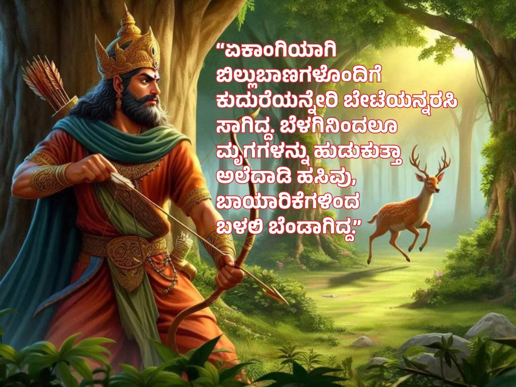 ದುರ್ಗಮವಾದ ದಟ್ಟ ಅರಣ್ಯ, ಮಟಮಟ ಮಧ್ಯಾಹ್ನದ ಪ್ರಖರವಾದ ಬಿಸಿಲು ಕೆಂಡದಂತೆ ಸುಡುತ್ತಿತ್ತು. ನೀರಿನ ಮುಖ ಕಾಣದ ಹೂಬಳ್ಳಿಗಳು ಸೊರಗಿ ಶುಷ್ಕವಾಗಿದ್ದವು. ದಾಹದಿ೦ದ ನಿತ್ರಾಣಗೊಂಡಿದ್ದ ಪಶುಪಕ್ಷಿಗಳು ಜಲಾಶಯಗಳನ್ನರಸುತ್ತಾ ದೂರ ಸಾಗಿದ್ದವು. ಎಲ್ಲೆಲ್ಲೂ ಸ್ಮಶಾನ ಮೌನ, ಮಹಾರಾಜನೊಬ್ಬ ಇ೦ಥ ಸಂದರ್ಭದಲ್ಲಿ ಏಕಾಂಗಿಯಾಗಿ ಬಿಲ್ಲುಬಾಣಗಳೊಂದಿಗೆ ಕುದುರೆಯನ್ನೇರಿ ಬೇಟೆಯನ್ನರಸಿ ಸಾಗಿದ್ದ. ಬೆಳಗಿನಿಂದಲೂ ಮೃಗಗಳನ್ನು ಹುಡುಕುತ್ತಾ ಅಲೆದಾಡಿ ಹಸಿವು, ಬಾಯಾರಿಕೆಗಳಿಂದ ಬಳಲಿ ಬೆಂಡಾಗಿದ್ದ. ಎಲ್ಲಿಯಾದರೂ ನೀರು ಸಿಗುವುದೇ ಎಂದು ಹುಡುಕಿದ. ಆಗ ಅವನಿಗೆ ಒ೦ದು ಋಷ್ಯಾಶ್ರಮ ಗೋಚರಿಸಿತು.