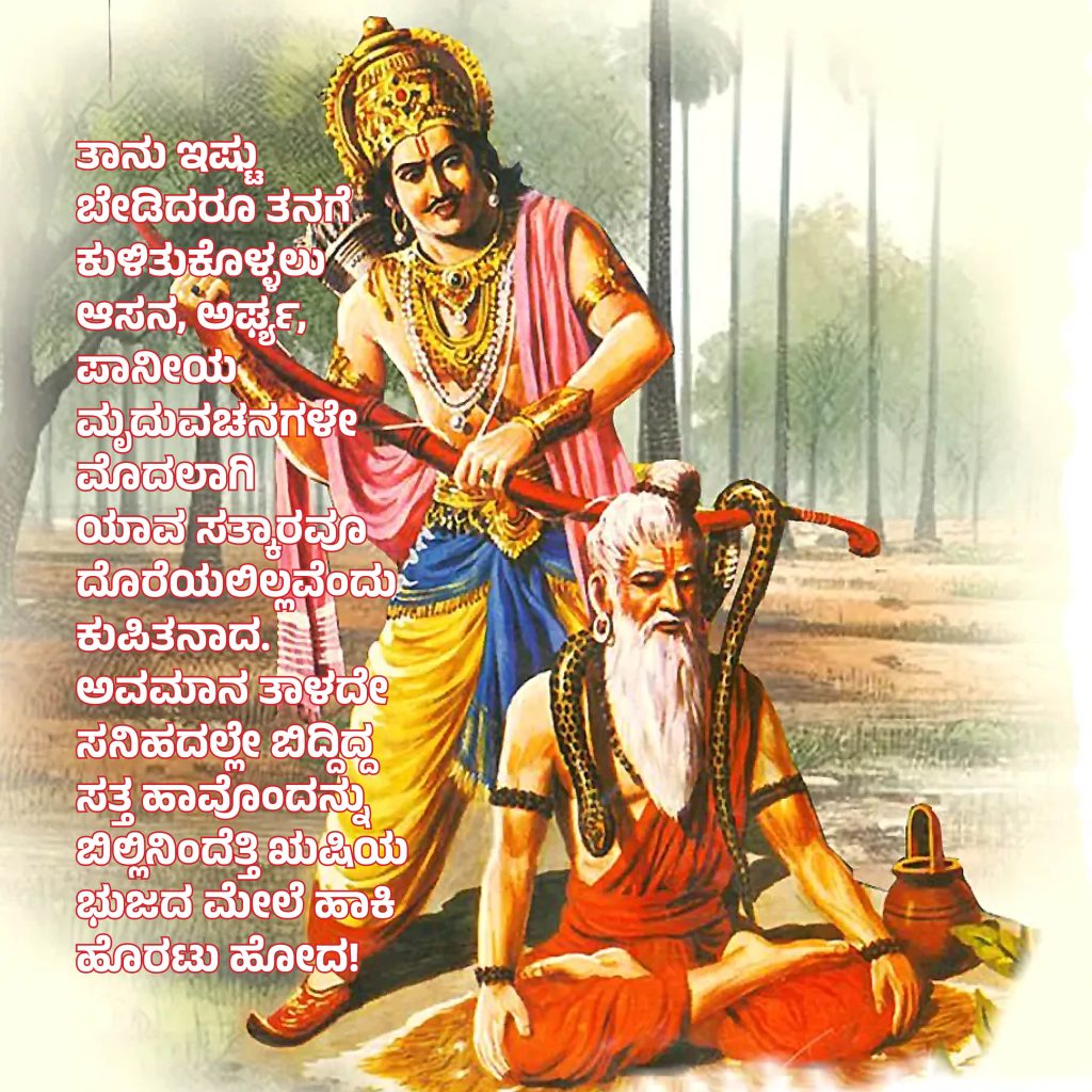 ರಾಜನಿಗೆ ಗಂಟಲು ಒಣಗಿಹೋಗುತ್ತಿತ್ತು. ನೀರು ಬೇಕೆಂದು ಆ ಮುನಿಯನ್ನು ಮತ್ತೆ ಮತ್ತೆ ಕೇಳಿದ. ಆದರೆ ಧ್ಯಾನಾಸಕ್ತ ಋಷಿಗೆ ಅವನ ಯಾವೊಂದು ಮಾತೂ ಕೇಳಿಸಲಿಲ್ಲ. ಹಸಿವು, ಬಾಯಾರಿಕೆಗಳಿಂದ ಮೊದಲೇ ಬಳಲಿದ್ದ ರಾಜ, ತಾನು ಇಷ್ಟು ಬೇಡಿದರೂ ತನಗೆ ಕುಳಿತುಕೊಳ್ಳಲು ಆಸನ, ಅರ್ಘ್ಯ, ಪಾನೀಯ ಮೃದುವಚನಗಳೇ ಮೊದಲಾಗಿ ಯಾವ ಸತ್ಕಾರವೂ ದೊರೆಯಲಿಲ್ಲವೆಂದು ಕುಪಿತನಾದ. ಅವಮಾನ ತಾಳದೇ ಸನಿಹದಲ್ಲೇ ಬಿದ್ದಿದ್ದ ಸತ್ತ ಹಾವೊಂದನ್ನು ಬಿಲ್ಲಿನಿಂದೆತ್ತಿ ಋಷಿಯ ಭುಜದ ಮೇಲೆ ಹಾಕಿ ಹೊರಟು ಹೋದ!