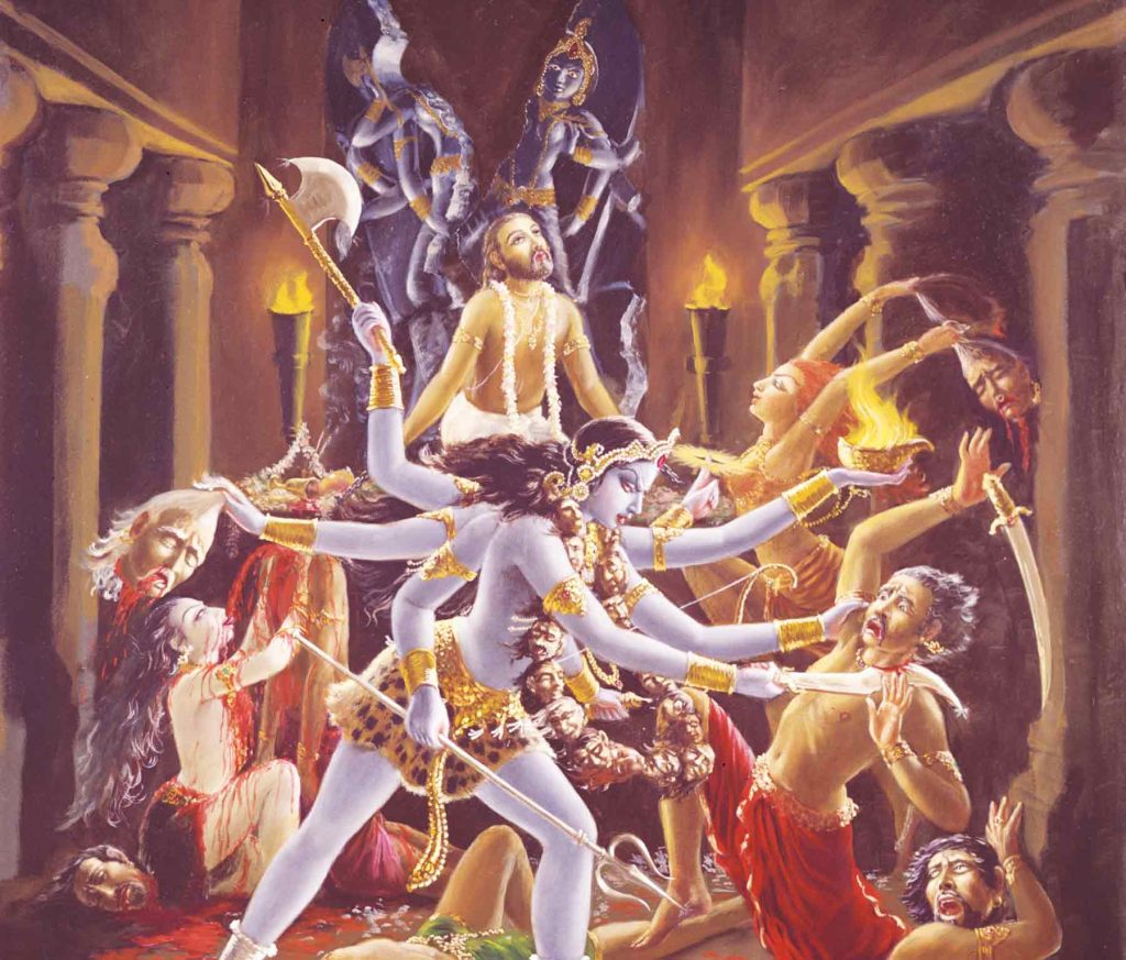 ಆ ಕಳ್ಳರೆಲ್ಲರೂ ರಜೋಗುಣ ಮತ್ತು ತಮೋಗುಣಗಳಿಂದ ಪ್ರಭಾವಿತರಾಗಿ ಅತಿಯಾದ ಧನಮದದಿಂದ ಕೂಡಿದ್ದರು! ಅತಿಯಾಗಿ ಹಣ ಸಂಪಾದಿಸುವ ಆಸೆಯಿಂದ ವೈದಿಕ ನಿಯಮಗಳಿಗೆ ವಿರುದ್ಧವಾಗಿ ಸದಾ ಕುತ್ಸಿತಕಾರ್ಯಗಳಲ್ಲೇ ತೊಡಗಿರುತ್ತಿದ್ದರು. ದುರ್ಮಾಗಿಗಳಾಗಿದ್ದ ಅವರು ಸದಾ ಹಿಂಸಾಚಾರಗಳಲ್ಲೇ ಆನಂದ ಪಡುತ್ತಿದ್ದರು. ಈಗಲಂತೂ ಒಬ್ಬ ಬ್ರಾಹ್ಮಣನನ್ನು, ಅದರಲ್ಲೂ ಬ್ರಹ್ಮಜ್ಞಾನಿಯೂ ಭಗವದ್ಭಕ್ತನೂ ಸಕಲ ಪ್ರಾಣಿಗಳ ಹಿತೈಷಿಯೂ ಆಗಿದ್ದ ಜಡಭರತನನ್ನು ಕೊಲ್ಲಲು ಹೊರಟು ಮಹಾಪಾಪವನ್ನೆಸಗುವುದರಲ್ಲಿದ್ದರು! ಇದು ಕಾಳಿಕಾದೇವಿಗೆ ಸಹಿಸಲಸಾಧ್ಯವಾಯಿತು! ಎಲ್ಲರ ಮಾತೆಯಾದ ಅವಳು ನರಬಲಿಯನ್ನು ಅಪೇಕ್ಷಿಸುವಳೇ? ಅದರಲ್ಲೂ ಮಹಾಭಕ್ತನೊಬ್ಬನ ಕೊಲೆಯನ್ನು ಸಹಿಸುವಳೇ? ಖಂಡಿತ ಇಲ್ಲ! ಆದ್ದರಿಂದ ಜಡಭರತನನ್ನು ರಕ್ಷಿಸಲೆಂದು ತಾನೇ ತಾನಾಗಿ ವಿಗ್ರಹದಿಂದ ಆವಿರ್ಭವಿಸಿದಳು!