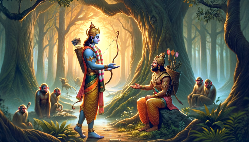 ಇದೇ ರೀತಿ ಸುಗ್ರೀವನೊಂದಿಗೂ ರಾಮನ ಸಖ್ಯ ವರ್ಣನಾತೀತವಾದುದು. ಸುಗ್ರೀವನೊಂದಿಗೆ ರಾಮ ವ್ಯವಹರಿಸಿದ ರೀತಿ ಆವರಿಬ್ಬರ ಉದಾತ್ತ ಮಿತೃತ್ವಕ್ಕೆ ಸಾಕ್ಷಿ. ಅಗ್ನಿಸಾಕ್ಷಿಯಾಗಿ ಸುಗ್ರೀವನೊಡನೆ ತನ್ನ ಮೈತ್ರಿಯನ್ನು ಘೋಷಿಸಿದಾಗ ರಾಮನ ಬಾಯಿಂದ ಹೊರಟ ಉದ್ಗಾರವಿದು : ತ್ವಂ ವಯಸ್ಯೋಸಿ ಮೇ ಹೃದ್ಯೋಹ್ಯೇಕಂ ದುಃಖಂ ಸುಖಂ ಚ ನೌ (ಕಿಷ್ಕಿಂಧಾ ಕಾಂಡ) – ‘ನೀನು ನನ್ನ ಪ್ರೀತಿಯ ಮಿತ್ರನಾಗಿರುವೆ. ನಮ್ಮ ಸುಖ ಹಾಗೂ ದುಃಖಗಳು ಏಕರೂಪವಾಗಿವೆ‘ ಎಂದು ಹೇಳುವ ಮೂಲಕ ಸುಗ್ರೀವನನ್ನು ತನ್ನ ಆತ್ಮ ಸಖನನ್ನಾಗಿ ಸ್ವೀಕರಿಸುತ್ತಾನೆ. ಸುಗ್ರೀವನು ತನ್ನ ದುಃಖದಲ್ಲಿ ಪಾಲ್ಗೊಳ್ಳಲು ಮುಂದಾಗುವ ಮೊದಲೇ, ಆತನಿಂದ ಯಾವುದೇ ಸಹಾಯ ಅಪೇಕ್ಷಿಸದೆಯೇ, ಅದರ ಬಗ್ಗೆ ಯೋಚಿಸುವುದಕ್ಕೂ ಮುಂಚೆಯೇ, ರಾಮನೇ ಅವನ ದುಃಖದಲ್ಲಿ ಭಾಗಿಯಾಗುತ್ತಾನೆ.
