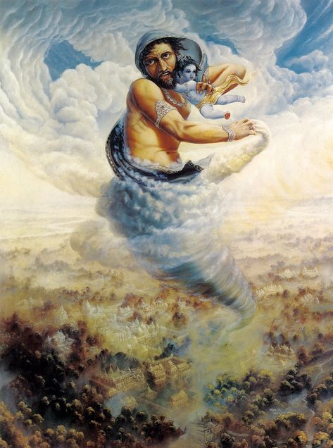 ಅವನು ಮಗುವನ್ನು ಮೇಲೆತ್ತಿಕೊಂಡು ತನ್ನ ಭುಜದಮೇಲಿರಿಸಿಕೊಂಡು, ವೃಂದಾವನವೆಲ್ಲ ಹರಡಿಕೊಳ್ಳುವ ಹಾಗೆ ಧೂಳಿನ ಬಿರುಗಾಳಿಯನ್ನು ಎಬ್ಬಿಸಿದ. ಎಲ್ಲರ ಕಣ್ಣುಗಳಲ್ಲೂ ಧೂಳು ತು೦ಬಿದ, ಕೆಲವೇ ನಿಮಿಷಗಳಲ್ಲಿ ವೃಂದಾವನದ ಎಲ್ಲ ಪ್ರದೇಶಗಳೂ ದಟ್ಟವಾಗಿ ಕತ್ತಲಾಗಿ ಹೋಗಿ, ಯಾರೂ ಯಾರನ್ನೂ, ಸ್ವತಃ ತಮ್ಮನ್ನೂ ನೋಡಿಕೊಳ್ಳಲು ಆಗದೇ ಹೋಯಿತು. ದೊಡ್ಡ ಕೋಲಾಹಲದ ನಡುವೆ ಮಗು ಕಾಣಿಸದೆ, ಯಶೋದಾ ಎಲ್ಲರ ಎದೆಯೊಡೆಯುವ ಹಾಗೆ ಅಳಲು ಪ್ರಾರಂಭಿಸಿದಳು. ಕರುವನ್ನು ಕಳೆದುಕೊಂಡ ಹಸು ನೆಲದ ಮೇಲೆ ಉರುಳುವ ಹಾಗೆ ಅವಳು ಉರುಳಿದಳು. ತಾಯಿ ಯಶೋದಾ ಜೋರಾಗಿ ಅಳುತ್ತಿರುವುದನ್ನು ನೋಡಿ ಅಲ್ಲಿನ ಗೋಪಿಕಾ ಸ್ತ್ರೀಯರೆಲ್ಲರೂ ಕೂಡಲೇ ಅಲ್ಲಿಗೆ ಓಡಿಬಂದು, ಮಗುವಿಗಾಗಿ ಹುಡುಕಾಡಿದರು. ಆದರೆ ಅವರಿಗೆ ಮಗು ಎಲ್ಲೂ ಕಾಣಿಸದೆ ತುಂಬಾ ನಿರಾಶೆಯಾಯಿತು.