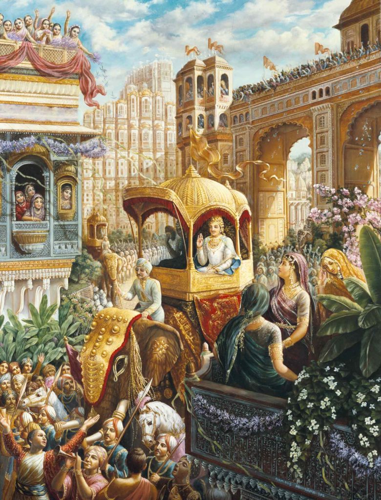ಯಜ್ಞಾಚರಣೆಯನ್ನು ಮುಗಿಸಿ ಪೃಥುವು ನಗರಪ್ರವೇಶ ಮಾಡಿದನು. ನಗರವನ್ನು ತಳಿರುತೋರಣ, ಹೂಮಾಲೆ, ಧೂಪಗಳಿಂದ ಸಿಂಗರಿಸಲಾಗಿತ್ತು. ಬೀದಿಗಳಲ್ಲಿ ಚಂದನ ಅಗರುಗಳ ನೀರನ್ನು ಚುಮುಕಿಸಿ ಹೂಗಳಿಂದ ದಾರಿಯನ್ನು ಸುಗಮಗೊಳಿಸಲಾಗಿತ್ತು. ಎಲ್ಲೆಲ್ಲೂ ದೀಪಗಳು ಕಂಗೊಳಿಸುತ್ತಿದ್ದವು. ಬಾಳೆಯ ಕಂಬಗಳು, ಹಣ್ಣುಗಳ ಗೊಂಚಲುಗಳು, ಆನೆಗಳ ಮೆರವಣಿಗೆಗಳು ಪೃಥುವಿಗೆ ವೈಭವದ ಸ್ವಾಗತವನ್ನು ಕೋರಿದವು. ರಾಜನು ಬರುತ್ತಿದ್ದಂತೆ, ಧೂಪದೀಪಗಳನ್ನೂ ಇತರ ಮಂಗಳದ್ರವ್ಯಗಳನ್ನೂ ಹಿಡಿದು, ಪ್ರಜೆಗಳೂ, ಸುಂದರ ಕುಂಡಲಾಭರಣಗಳಿಂದ ಸುಶೋಭಿತರಾದ ಕನ್ಯಾಮಣಿಗಳೂ ಆದರದಿಂದ ಸ್ವಾಗತಿಸಿದರು. ಶಂಖದುಂದುಭಿಗಳು ಮೊಳಗಿದವು. ಬ್ರಾಹ್ಮಣರು ವೇದಘೋಷ ಮಾಡಿದರು. ಹಿರಿಯರೂ, ಪ್ರಜೆಗಳೂ ಅವನಿಗೆ ಜಯಕಾರ ಮಾಡಿದರು. ಇಷ್ಟೆಲ್ಲ ವೈಭವದ ಸ್ವಾಗತ ದೊರೆತರೂ ಪೃಥುವಿನ ಮನಸ್ಸಿನಲ್ಲಿ ಒಂದಿಷ್ಟೂ ಅಹಂಕಾರ ಮೂಡಲಿಲ್ಲ.