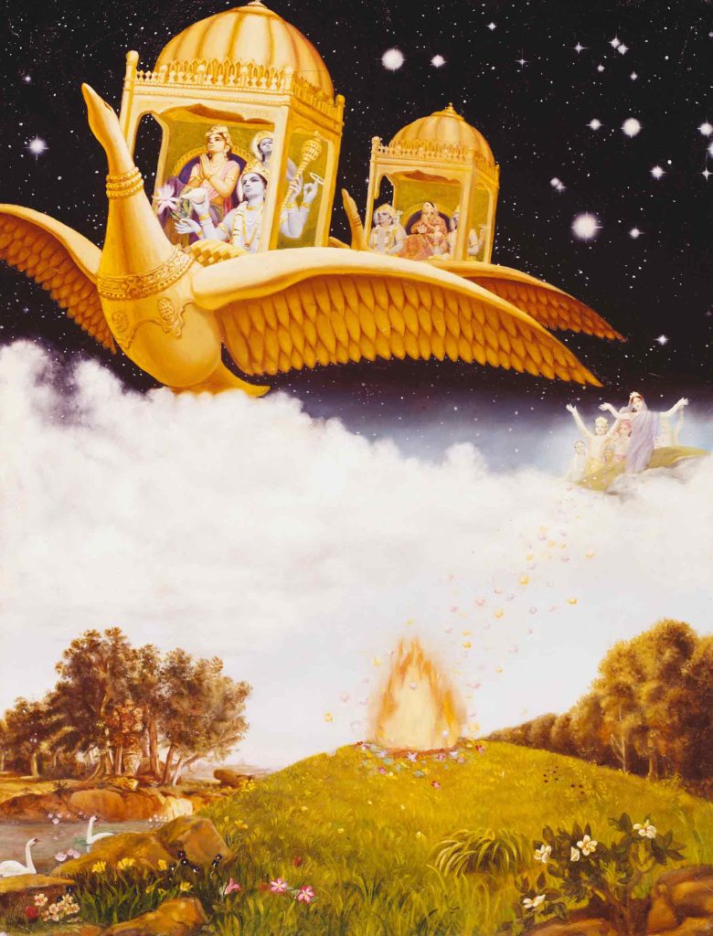 ಆಗ ದೇವತೆಗಳು, ಪೃಥುವೂ ಅವನ ಪತ್ನಿಯೂ ಒಂದೊಂದು ವಿಮಾನವನ್ನೇರಿ ವೈಕುಂಠದತ್ತ ಹೋಗುತ್ತಿರುವುದನ್ನು ಕಂಡು ಉದ್ಗರಿಸಿದರು,