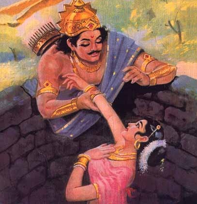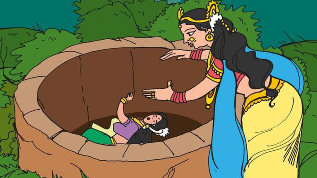 “ಏಯ್, ಹೊಟ್ಟೆಪಾಡಿಗಾಗಿ ಕಾಗೆಗಳ ಹಾಗೆ ನಮ್ಮನ್ನು ಅವಲಂಬಿಸಿ ನಮ್ಮ ಮನೆ ಬಾಗಿಲ ಬಳಿ ಕಾಯುವ ಭಿಕ್ಷುಕಿ ನೀನು…’ ಎಂದೆಲ್ಲ ಹೇಳಿಬಿಟ್ಟಳು. ಮತ್ತೆ ನಗ್ನಳಾಗಿದ್ದ ದೇವಯಾನಿಯನ್ನು ಅಲ್ಲೇ ಇದ್ದ ಒಂದು ಬರಡು ಬಾವಿಗೆ ತಳ್ಳಿ ಬಿಟ್ಟಳು. ಸಖಿಯರೆಲ್ಲರೂ ಹೊರಟುಹೋದರು.